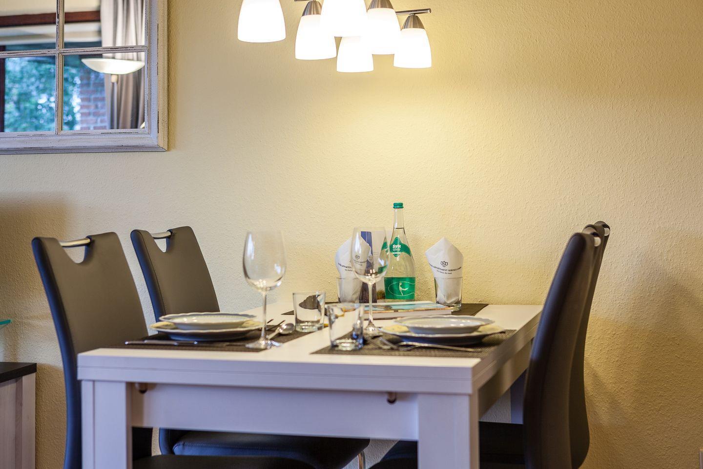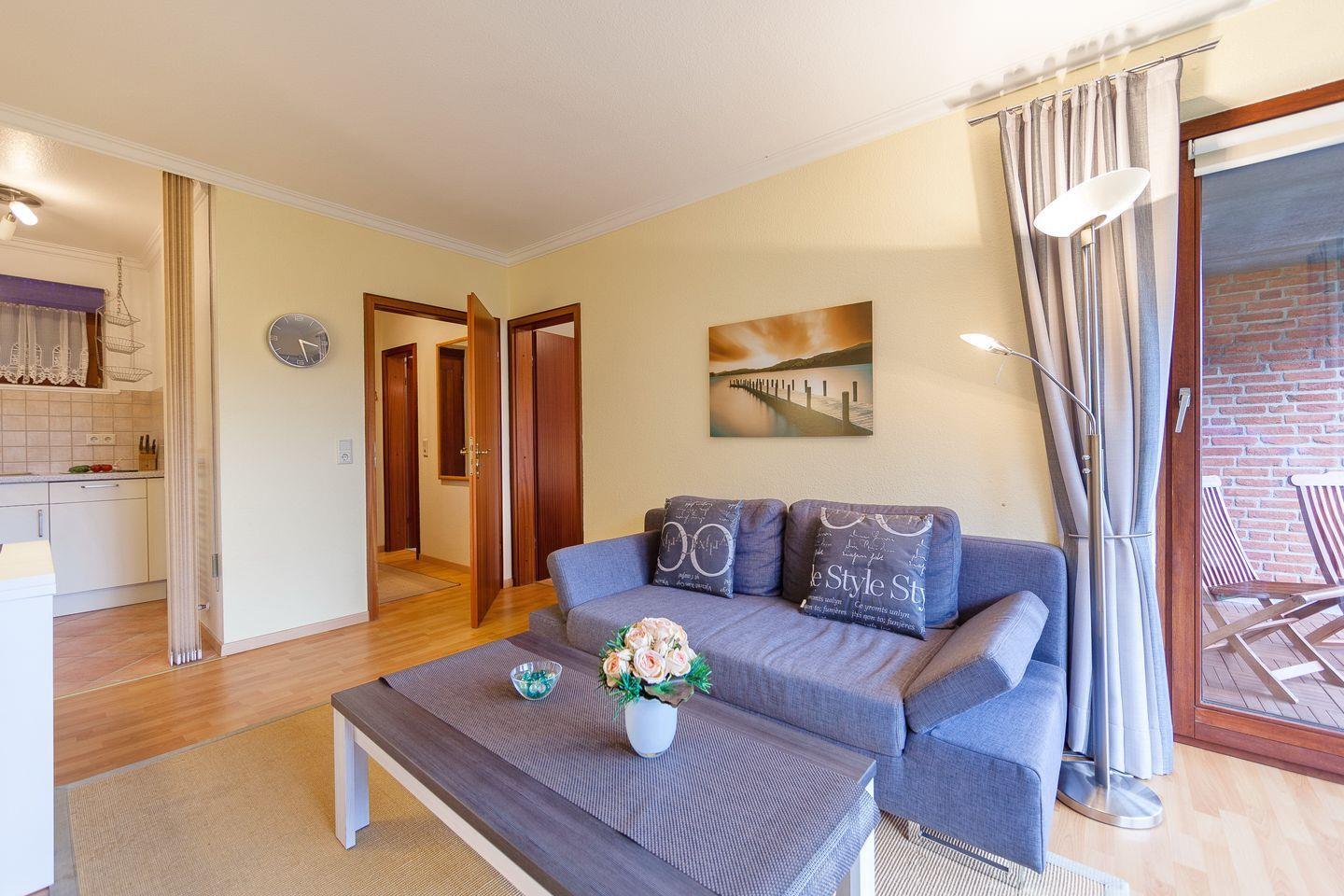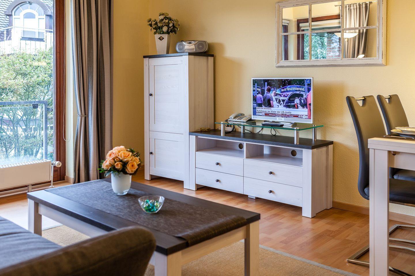 Wohnraum mit Flatscreen-TV, CD-Player, Radio, Telefon inklusive Flatrate ins Festnetz der dt. Telekom und WLAN-Anschluss. Küche mit Backofen, Microwelle, Geschirrspüler und Wasserkocher. Badezimmer mit Dusche und WC sowie einem Handtuchtrockner. Balkon mit Gartenmöbeln (ca. April - Oktober).