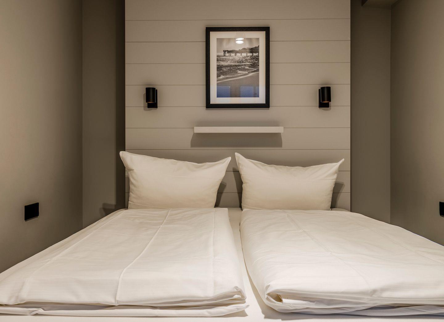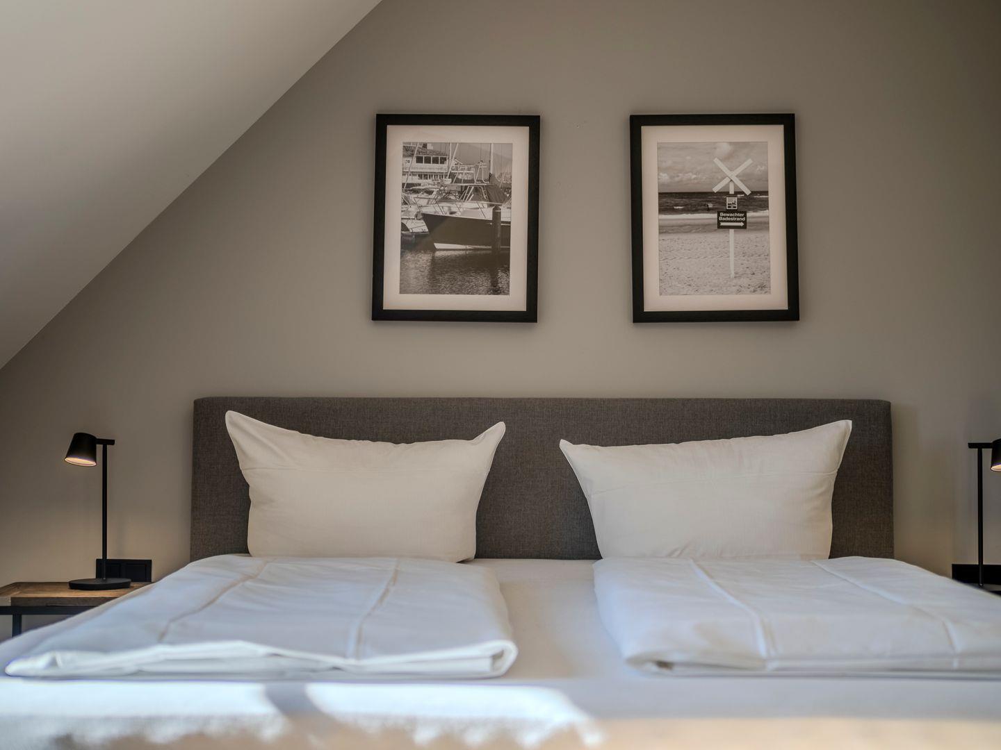 Zwei Doppelschlafzimmer, die beide über ein TV-Gerät, Hotelsafe, Verdunkelungsmöglichkeiten für die Fenster und Stauraum in Form von Kommoden, Garderoben oder Einbauschränken für Kleidung und persönliche Dinge verfügen. Das größere Schlafzimmer bietet einen kleinen Schreibbereich, der auch mobiles Arbeiten im Urlaub ermöglicht, einen begehbaren Kleiderschrank und Meerblick.