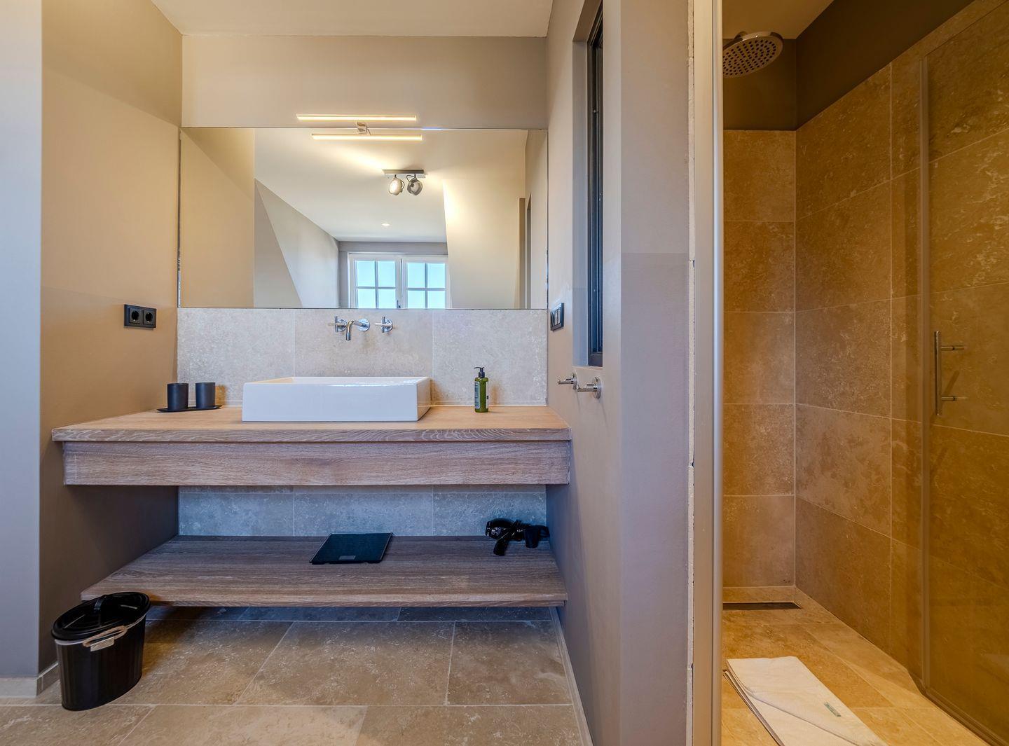 Zwei Badezimmer mit bodengleicher Regendusche, Handtuchtrockner. Eines der Badezimmer verfügt zusätzlich über eine freistehende Badewanne, Radio und Meerblick.