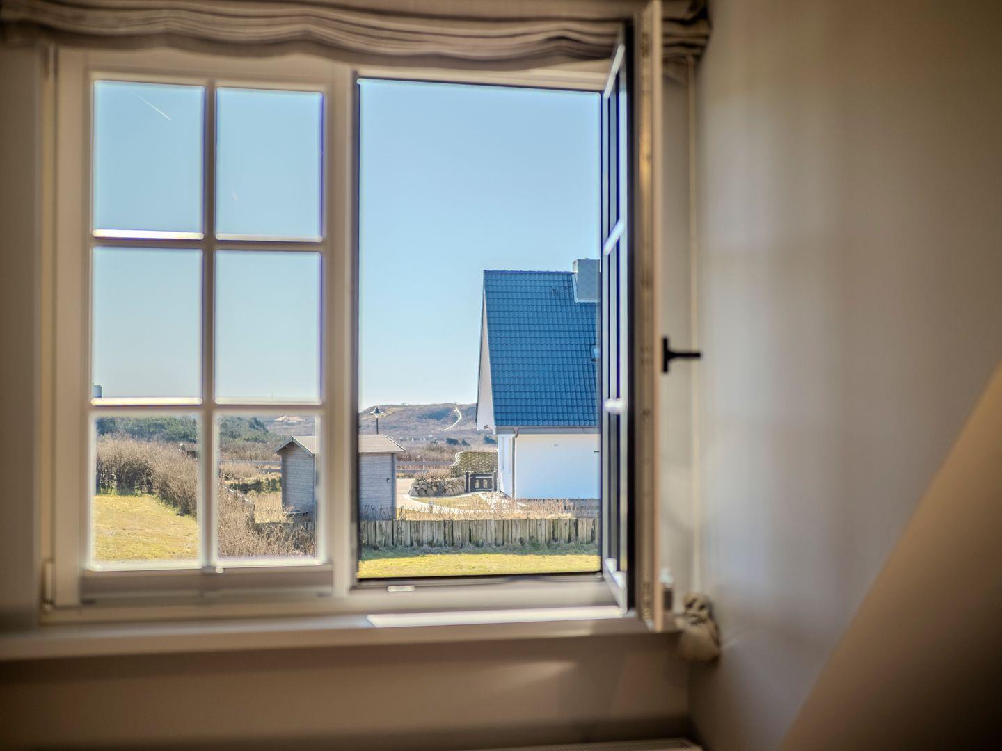 Vom Wohn- und Esszimmer gelangen Sie auf die möblierte Südterrasse mit Ganzjahresstrandkorb und können das Meeresrauschen der Nordsee hören. Eine kleine Erhebung im Garten ermöglicht den Blick über die Dünen auf die Nordsee.