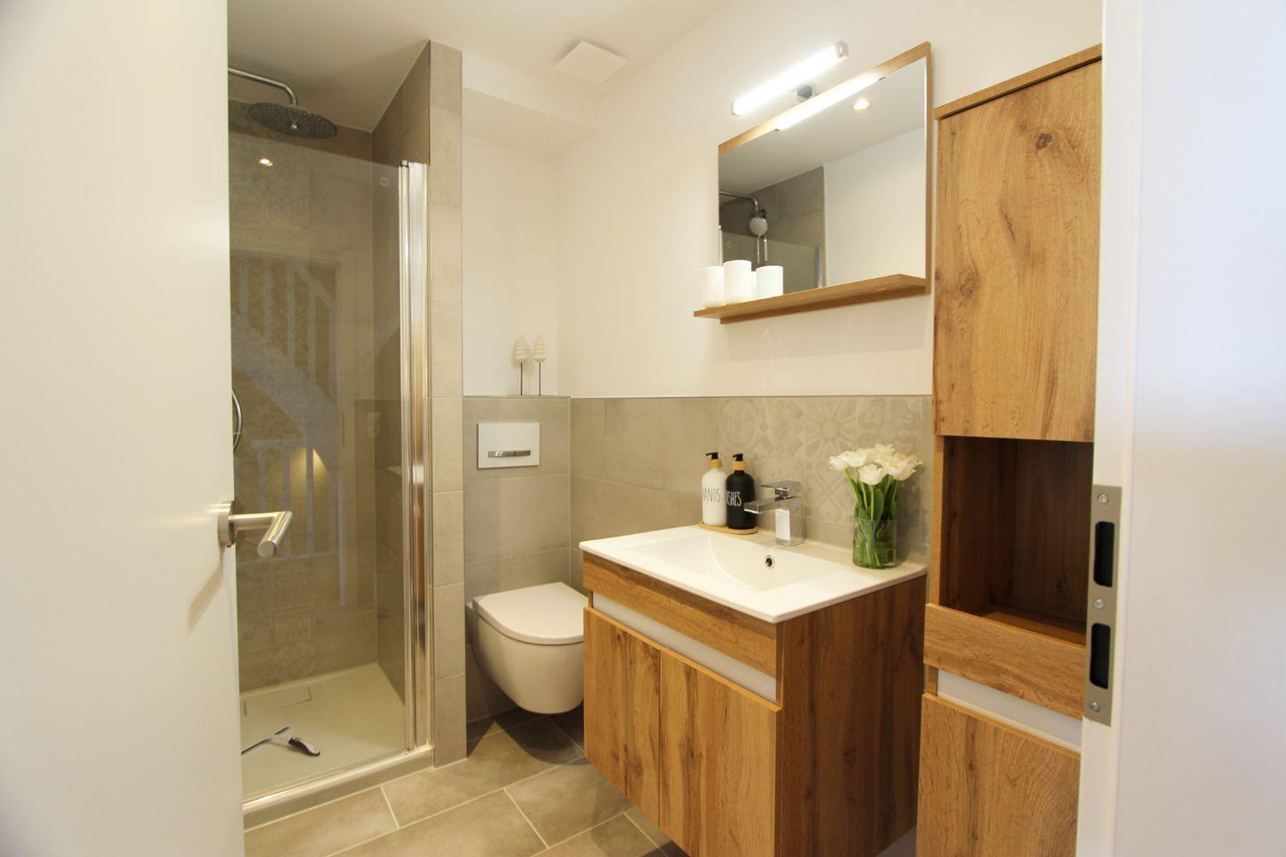 Im modernen, frisch renovierten Bad mit großen Fliesen in warmen Farbtönen und flacher Dusche können Sie Sand und Salz nach einem Strandtag bequem abduschen.