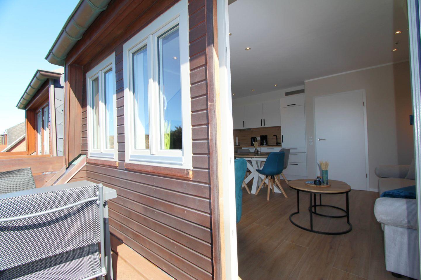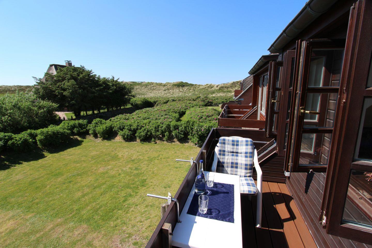 Auf dem Südbalkon sind Sie den ganzen Tag auf der Sonnenseite! Nehmen Sie auf den Balkonmöbeln Platz und genießen Sie die Aussicht auf die Dünen.