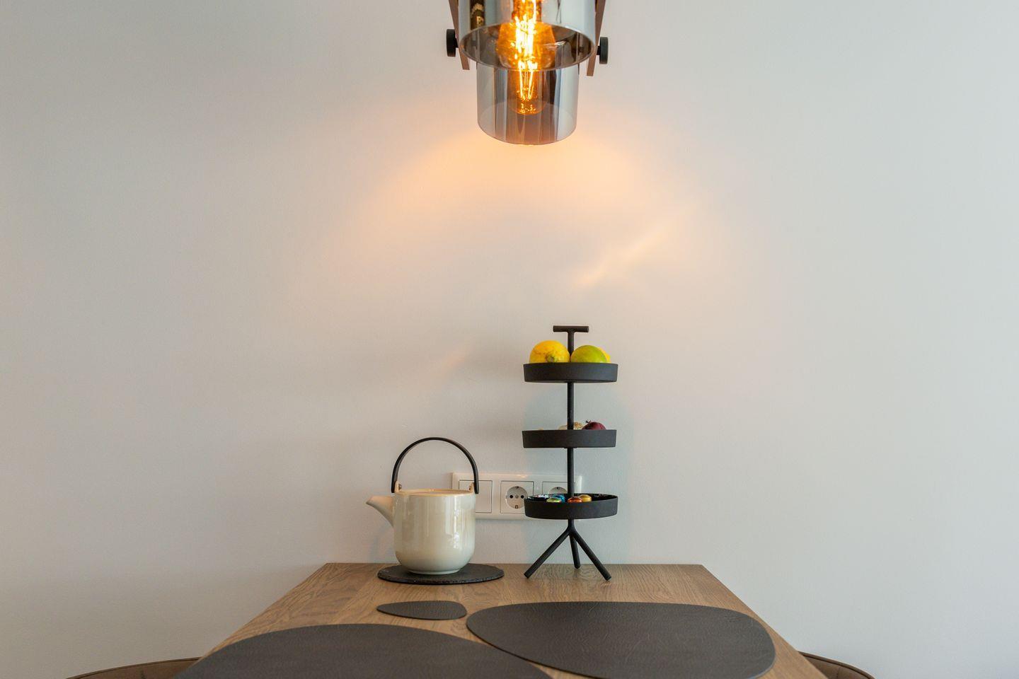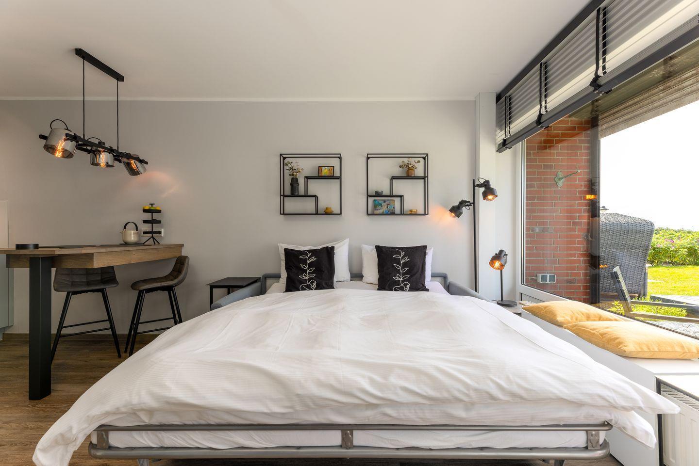 Ein Raum und ganz viele Möglichkeiten: die hochwertige Couch lädt tagsüber zum chillen ein, während sie sich abends im Handumdrehen in ein kuscheliges Bett verwandelt. Traumhaft ist auch der Ausblick von hier auf die kleine Terrasse (Südwest), auf der es sich im Sommer genauso hervorragend frühstücken lässt wie im Winter drinnen an dem Tresen im Industrial-Syle. Und überhaupt ist Style im Appartement Isola ein großes Thema: Markante Leuchten und Accessoires in Schwarz bilden den perfekten Rahmen zu grauen Möbeln und grünen Tischlereinbauten, die für extra viel Stauraum sorgen. Auch die Küche schmiegt sich passgenau in die Ecke und lässt mit ihren Markengeräten und dem smarten Backoffen in Griffhöhe nichts an technischen Raffinessen vermissen.