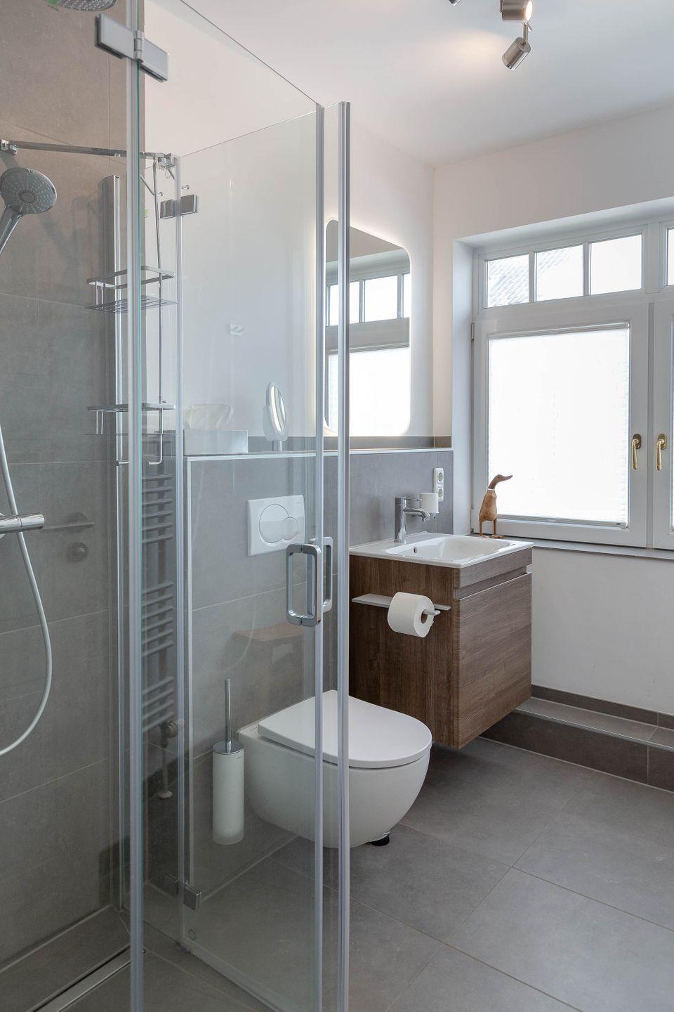 Das Badezimmer ist von Tageslicht durchströmt sind und empfängt Sie komfortabel mit einer ebenerdigen Dusche. Im Keller dieses Hauses befinden sich Waschmaschine und Trockner, welche sie kostenfrei nutzen können.