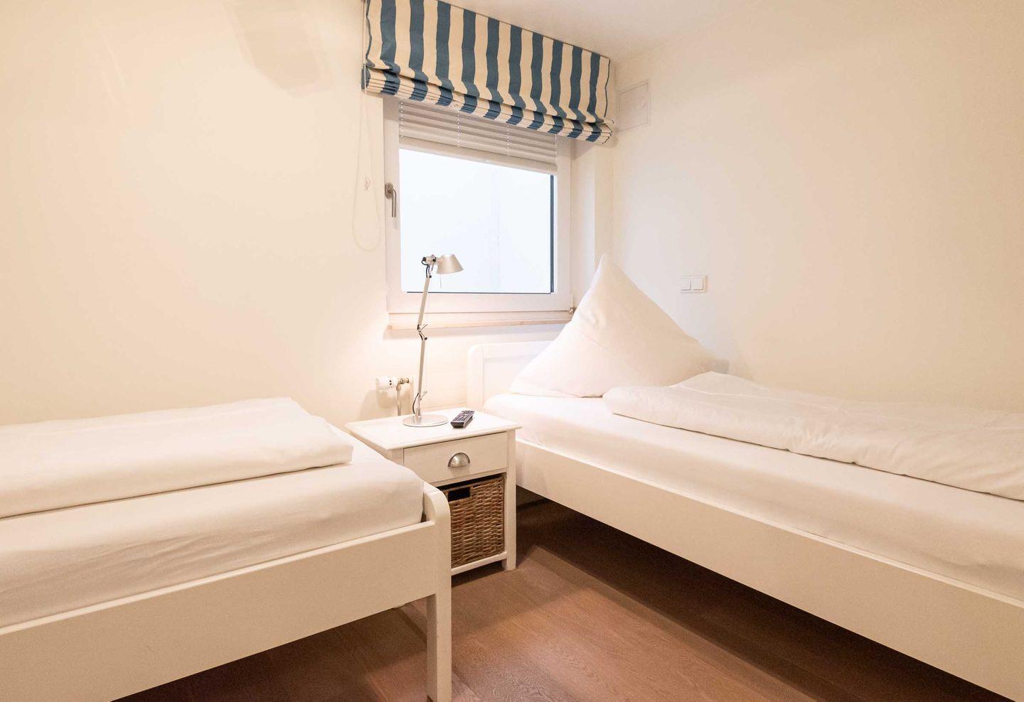 Schlafzimmer 2: 2 Einzelbetten, Kleiderschrank, TV und Fenster.