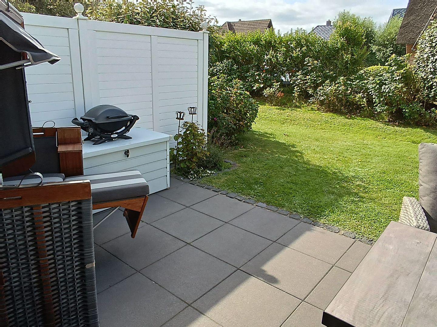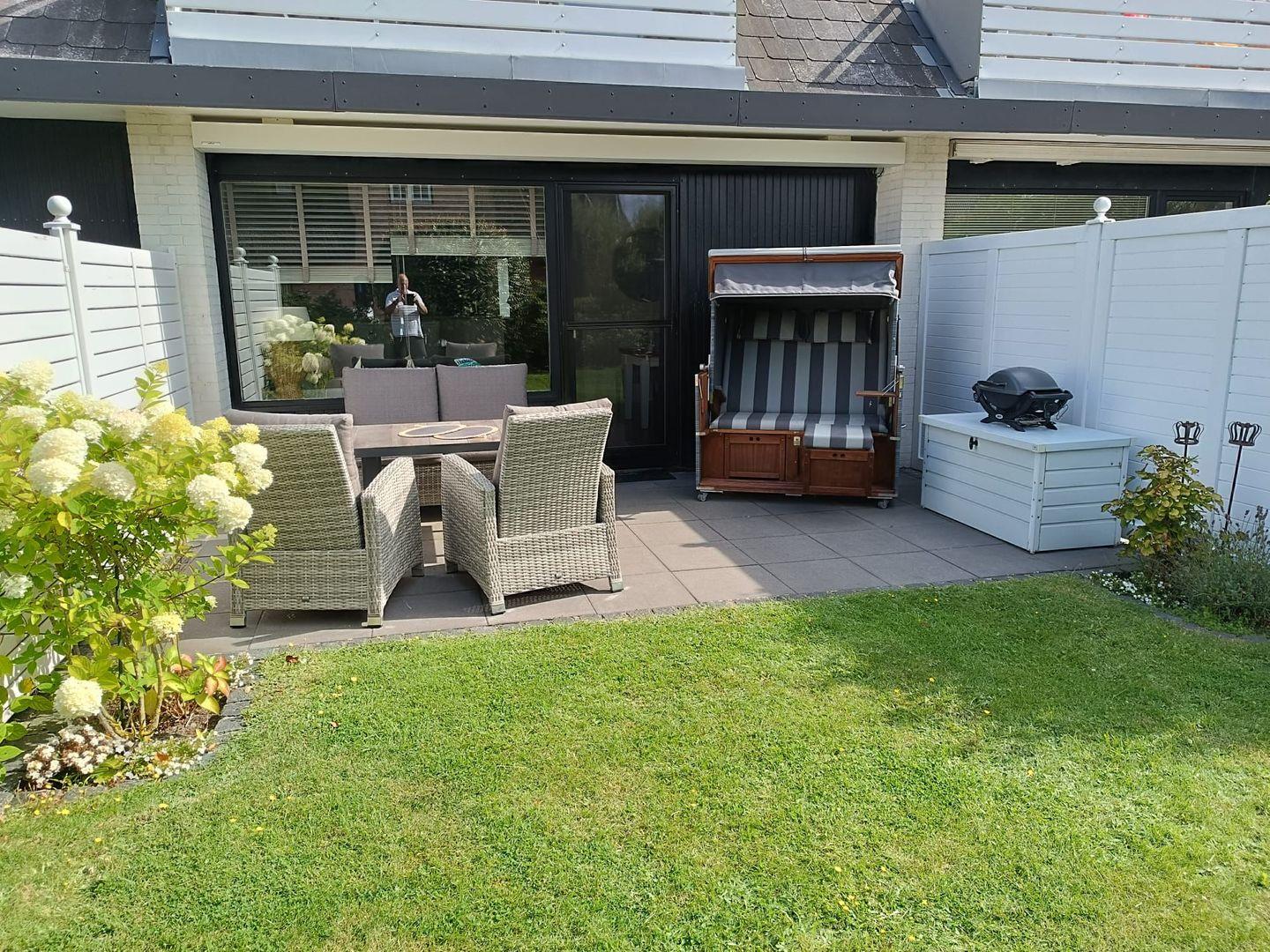 Im „Inselglück“ erwartet euch eine großzügige, sonnige Südterrasse, auf der ihr euch rundum wohlfühlen könnt. Ein gemütlicher Sylter Strandkorb, komfortable Gartenmöbel sowie eine elektrische Markise laden zum Verweilen ein. An warmen Sommerabenden steht euch ein hochwertiger Weber-Elektrogrill für gemeinsame Grillabende zur Verfügung. Die gepflegte Grünfläche sorgt für zusätzlichen Freiraum und garantiert Entspannung pur.