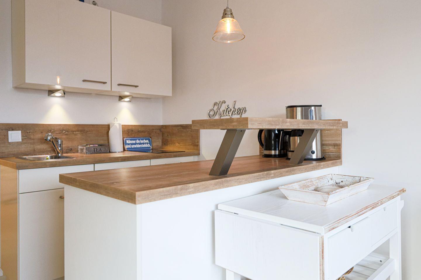 In der voll ausgestatteten Küchenzeile können Sie nach Herzenslust kochen. Der Essensplatz im Wohnbereich lädt zu entspannten Mahlzeiten ein.