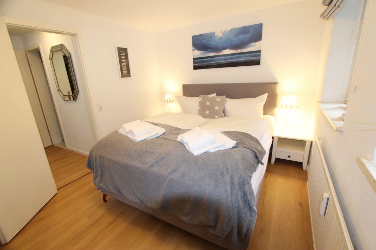 Eine Wendeltreppe führt ins Untergeschoss der Wohnung, wo sich die Schlafräume befinden. Ein Schlafzimmer ist mit einem Boxspringbett (160 x 200 cm, durchgehender Topper), das andere mit zwei Einzelbetten ausgestattet. Beide Schlafzimmer verfügen über einen Fernseher.