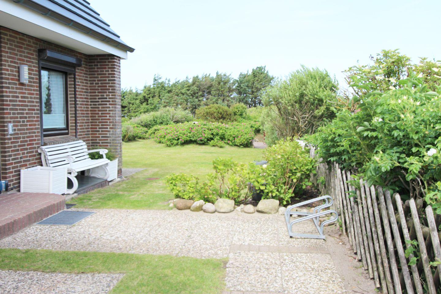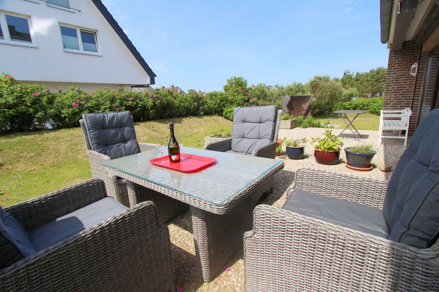 Vom Wohnzimmer aus gelangen Sie auf die West-Terrasse mit Gartenmöbeln. Zusätzlich steht Ihnen ein Strandkorb in einer Sonnenkuhle zur Verfügung (April bis Oktober). Die Sonnenkuhle liegt im hinteren Gartenteil und ist nur über die Haustür zu erreichen.