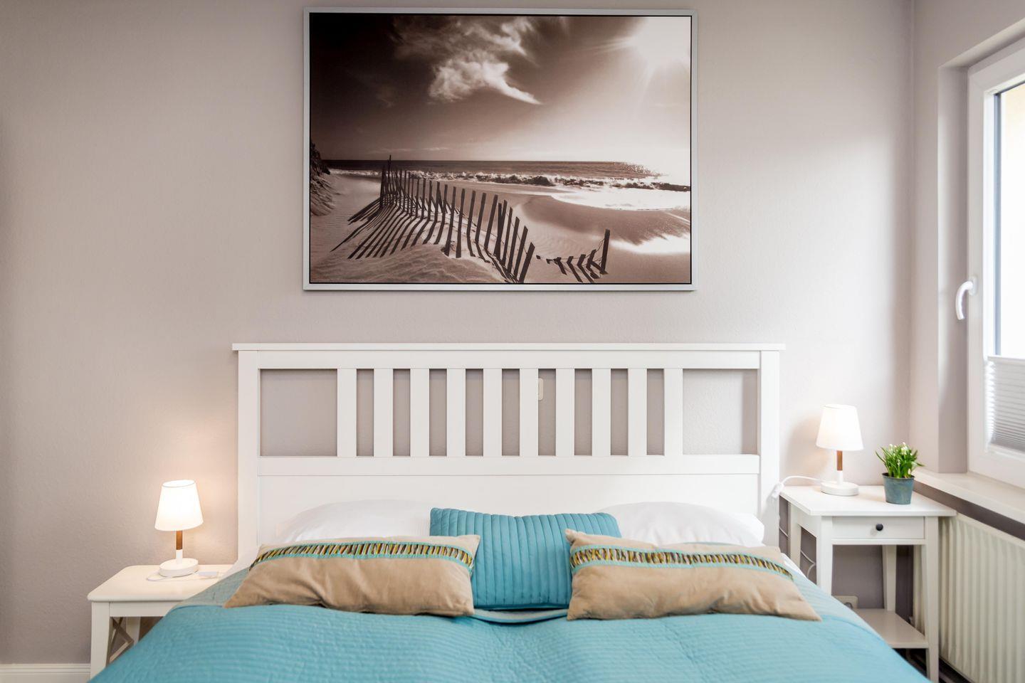 Das lichtdurchflutete Wohnzimmer des Erdgeschoss-Appartements Austernperle besticht mit seiner hellen und modernen Einrichtung und den großen Sprossenfenstern. Sie blicken auf den Garten, der mit Strandkörben zum Verweilen einlädt. Das große Schlafzimmer mit Doppelbett und großem Schrank liegt ruhig nach hinten raus. Das angrenzende Bad ist ein Tageslichtbad.