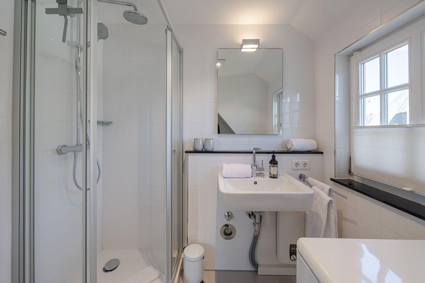 Das Schlafzimmer ist gemütlich und mit viel Gefühl eingerichtet – ein ruhiger Rückzugsort mit komfortablem Doppelbett und warmem Parkettboden, in dem man sich sofort wohlfühlt. Das helle Bad bietet eine moderne Dusche und lädt dazu ein, nach einem langen Strandtag erfrischt und entspannt in den Abend zu starten. Eine Waschmaschine mit Trocknerfunktion steht Ihnen zur eigenen Nutzung zur Verfügung – ein kleines Extra, das den Aufenthalt noch angenehmer macht.