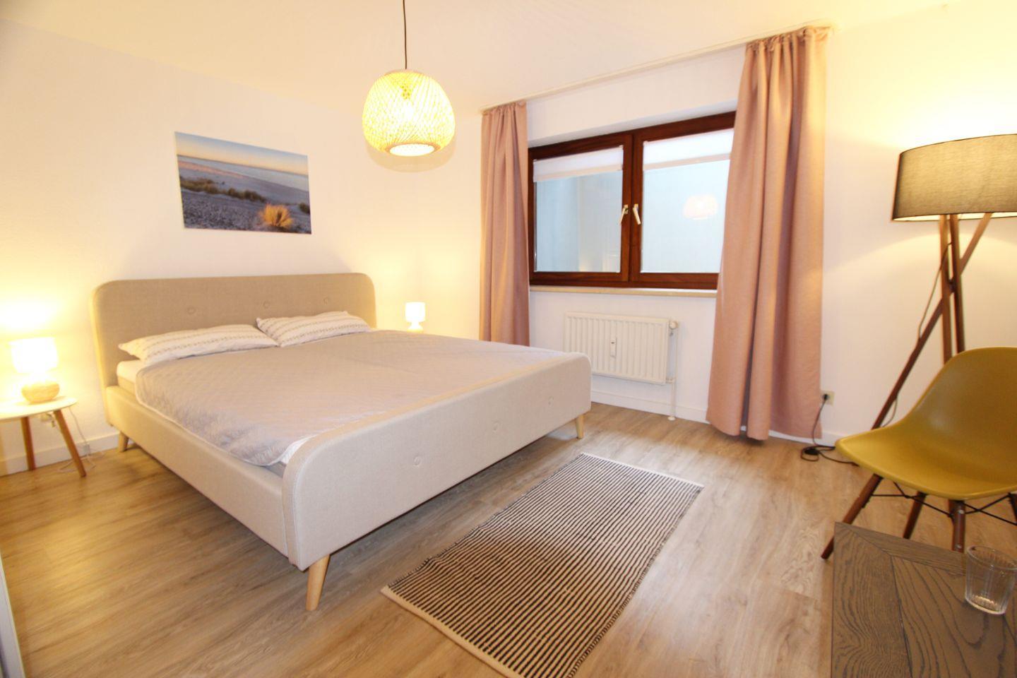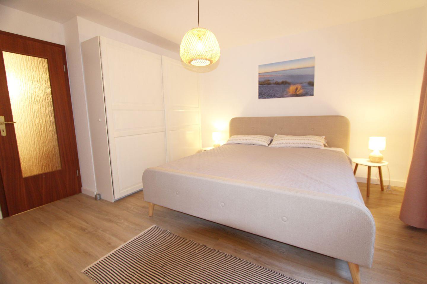 Schlafen Sie im gemütlich eingerichteten Doppelschlafzimmer im Untergeschoss mit angrenzendem Duschbad/WC. Die ruhige Farbgebung sorgt für ein angenehmes Ambiente. Auf dem Schlafsofa im Wohnzimmer kann eine weitere Person schlafen (Kind ab 10 Jahren).