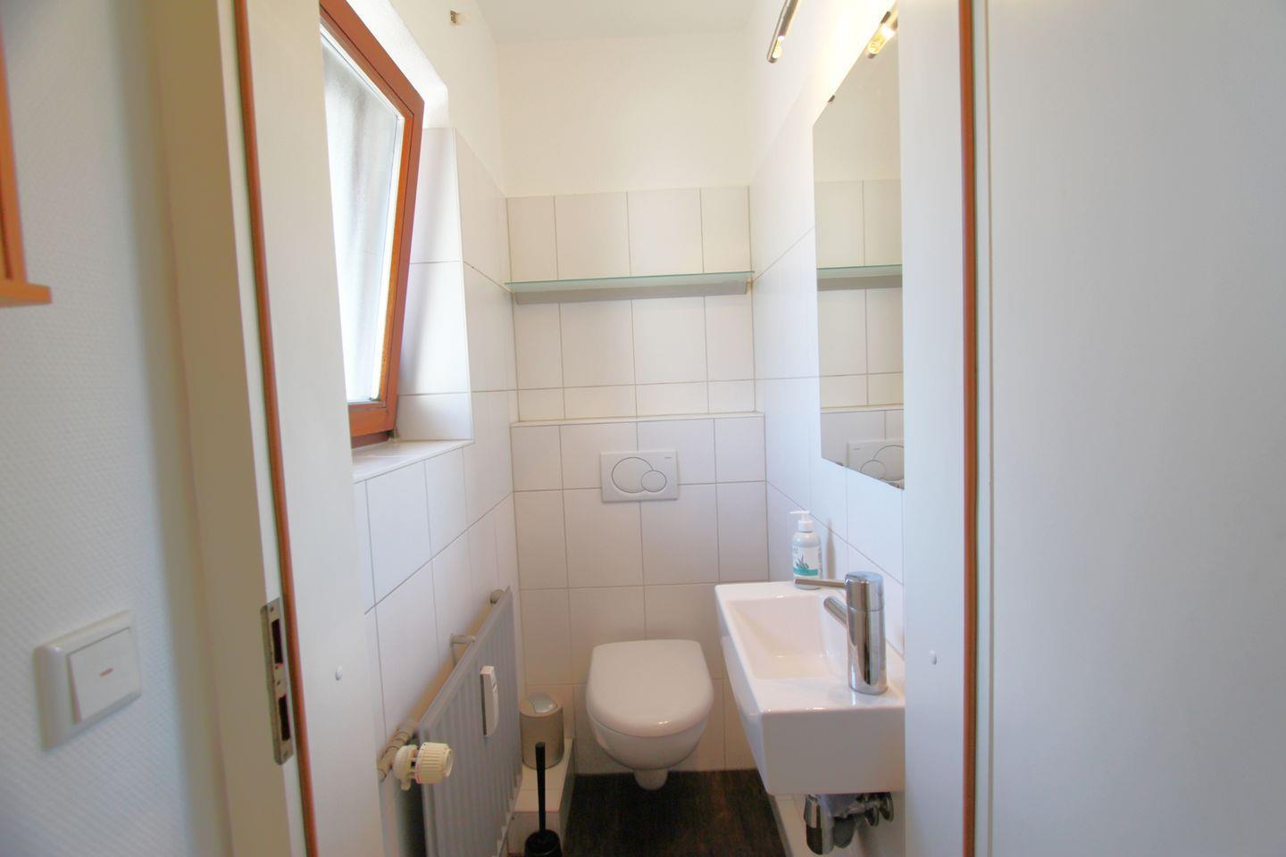 Auf einer Ebene mit dem Wohn-Essbereich befindet sich ein Gäste-WC im Erdgeschoss. Darüber hinaus finden Sie im Untergeschoss ein Bad mit Dusche und WC. Hier steht Ihnen auch eine Waschmaschine zur Verfügung.