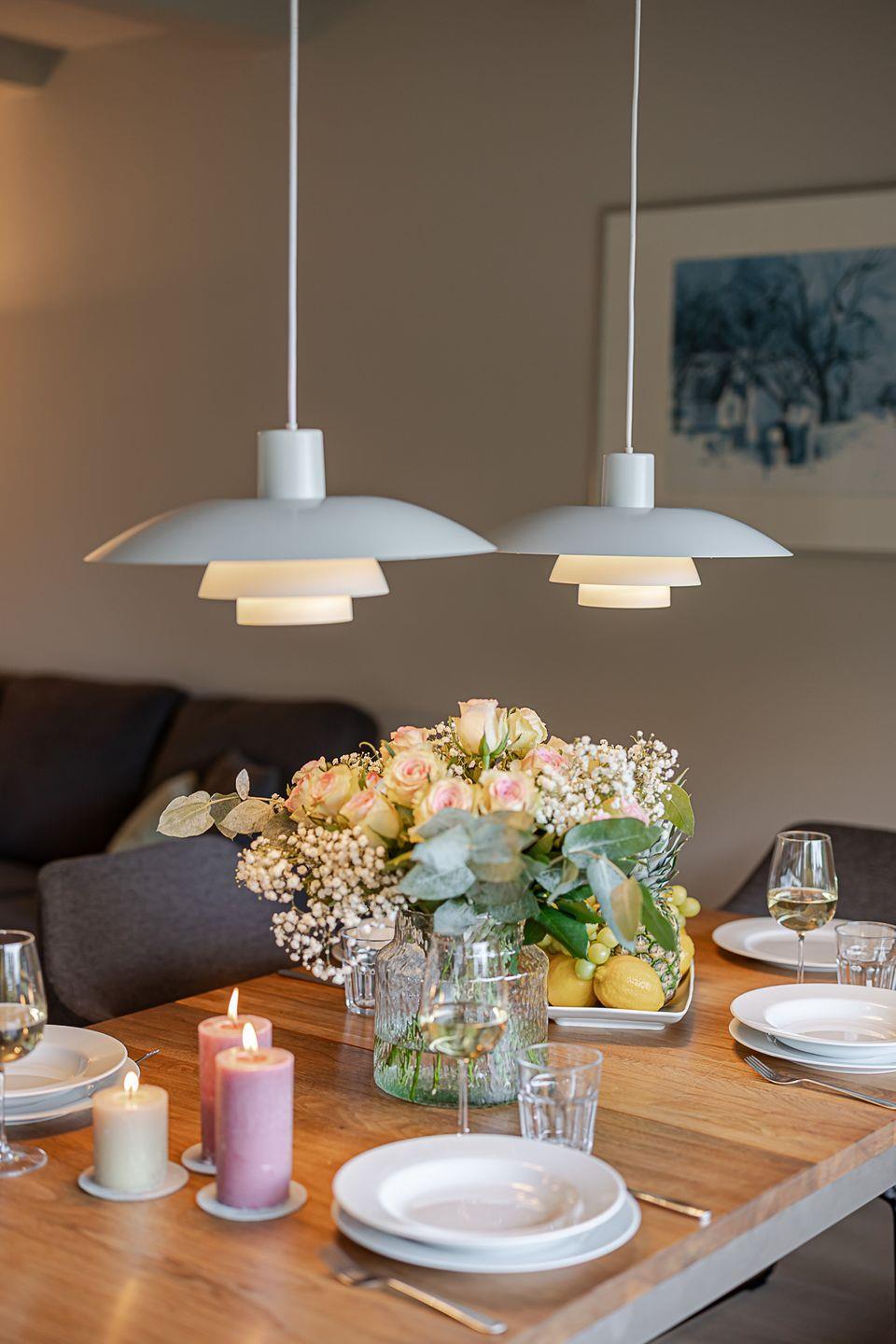 Im Erdgeschoss öffnet sich ein heller Wohn- und Essbereich, in dem nordische Zurückhaltung und gemütliche Eleganz perfekt harmonieren. Eine komfortable Sofalandschaft lädt zu entspannten Stunden ein, während der angrenzende Essplatz mit Blick in den Garten den idealen Rahmen für gemeinsame Mahlzeiten bietet. Die offene Küche ist modern ausgestattet – mit Spülmaschine, Backofen, Nespressomaschine und allem, was Sie für einen genussvollen Aufenthalt benötigen.