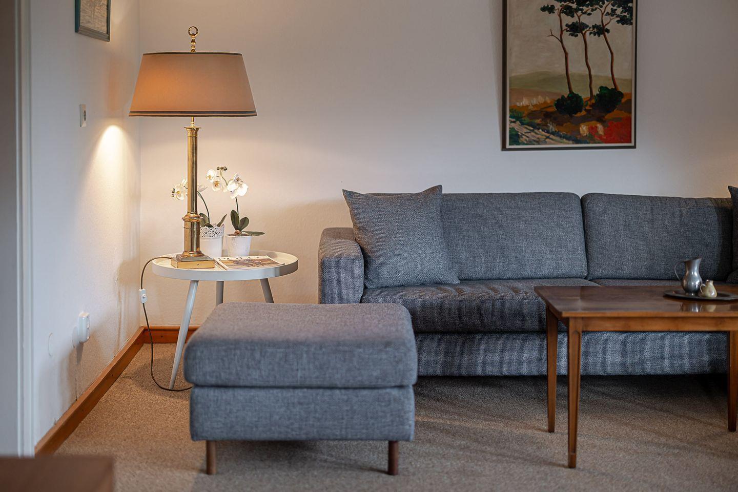 Das Herzstück der Wohnung ist der große Wohn- und Essbereich, der mit seiner Fensterfront den Blick über Reetdächer hinweg bis zum Wattenmeer freigibt. Hier trifft nordische Schlichtheit auf wohnliche Eleganz – gemütliche Sofas, warme Lichtstimmung und viel Platz für gemeinsame Stunden. Der angrenzende Essplatz lädt zu langen Frühstücken oder geselligen Abenden ein, während die offene Küche mit modernen Geräten (Backofen, Spülmaschine, Nespresso- und Filtermaschine) alles bietet, was man für den Urlaub braucht.