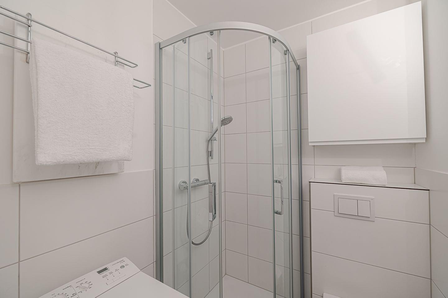 Das erste Badezimmer präsentiert sich hell und modernisiert, mit einer großzügigen Dusche und klaren Linien. Es verfügt zwar über kein Fenster, wirkt durch die helle Gestaltung und die stimmige Beleuchtung jedoch freundlich und einladend – perfekt für den Start in den Tag.