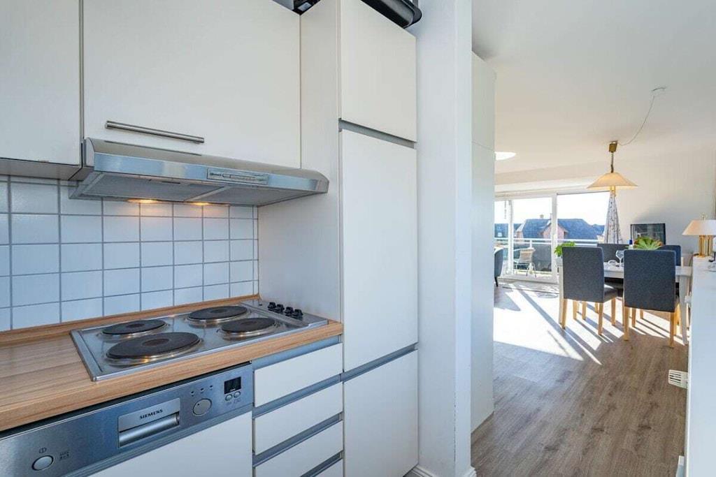 Seahorse Apartment From the large south-facing balcony, you can enjoy a stunning view over the rooftops of Wenningstedt all the way to the dunes. The Seahorse apartment, which was newly renovated in 2021, is located on the upper floor. After a short hallway, you'll find the large living-dining area. A separate fitted kitchen with all necessary appliances is located in front of the large window. The dining table is located in the elegant living area. The shower room with toilet is also on this level. Upstairs, you'll find the bedroom with a double bed and plenty of closets for your clothes. Pets are not allowed.