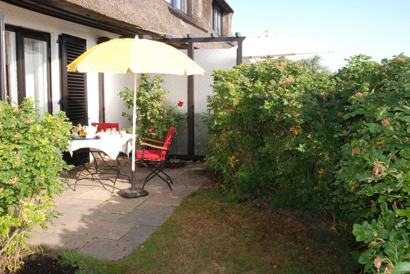 - Gartenterrasse mit ca. 80 m² durch Rosenhecke sichtgeschütztem Privatbereich mit Sitzecke, Strandkorb, Sonnenschirm und Zugang zum weitläufigen Wiesengelände