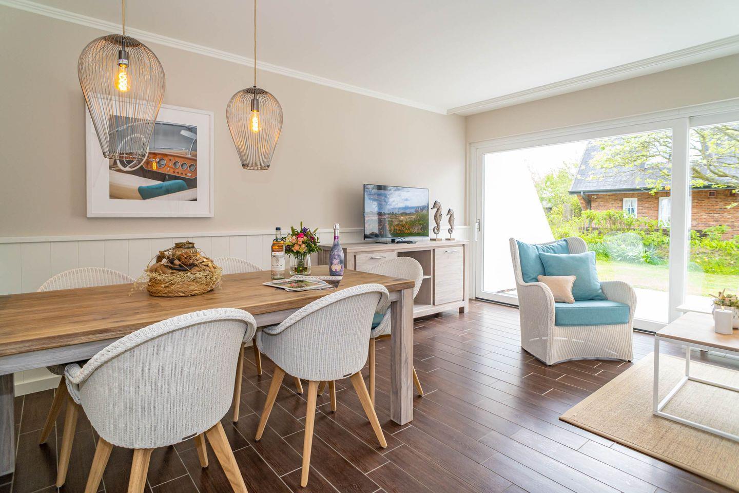 Die Ferienwohnung bietet Ihnen drei Zimmer auf zwei Ebenen (Erdgeschoss + Souterrain) mit ca. 70 qm Wohnfläche. Im EG befindet sich das große Wohnzimmer mit einem schönen Essbereich. Das Wohnzimmer ist mit einem Flatscreen-TV, einer Hifi-Anlage, einem DVD-Player und einem W-LAN-Anschluss ausgestattet. Außerdem verfügt das EG über eine halboffene, moderne Küche (Geschirrspüler, Backofen, Kaffemaschine) mit Durchreiche zum Esstisch und einem Schlafzimmer mit einem Doppelbett (140 x 200 cm). Im Souterrain sind das Duschbad mit WC und ein gemütliches Schlafzimmer mit großem Fenster, Doppelbett (180 x 200 cm) und Flatscreen-TV gelegen. Auf der wunderschönen Südterrasse mit Gartenmöbeln und Strandkorb (saisonal) lässt es sich besonders gut erholen!