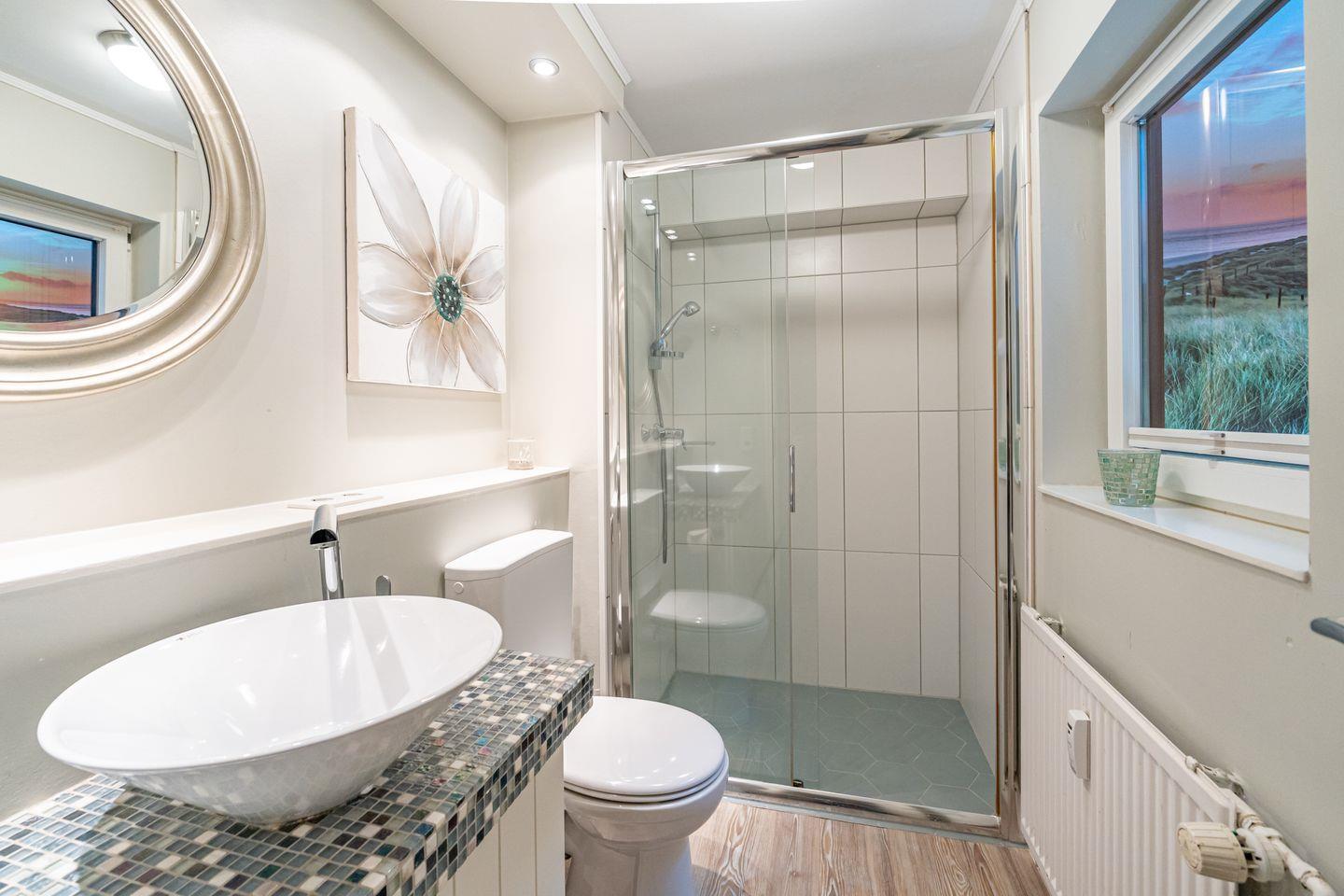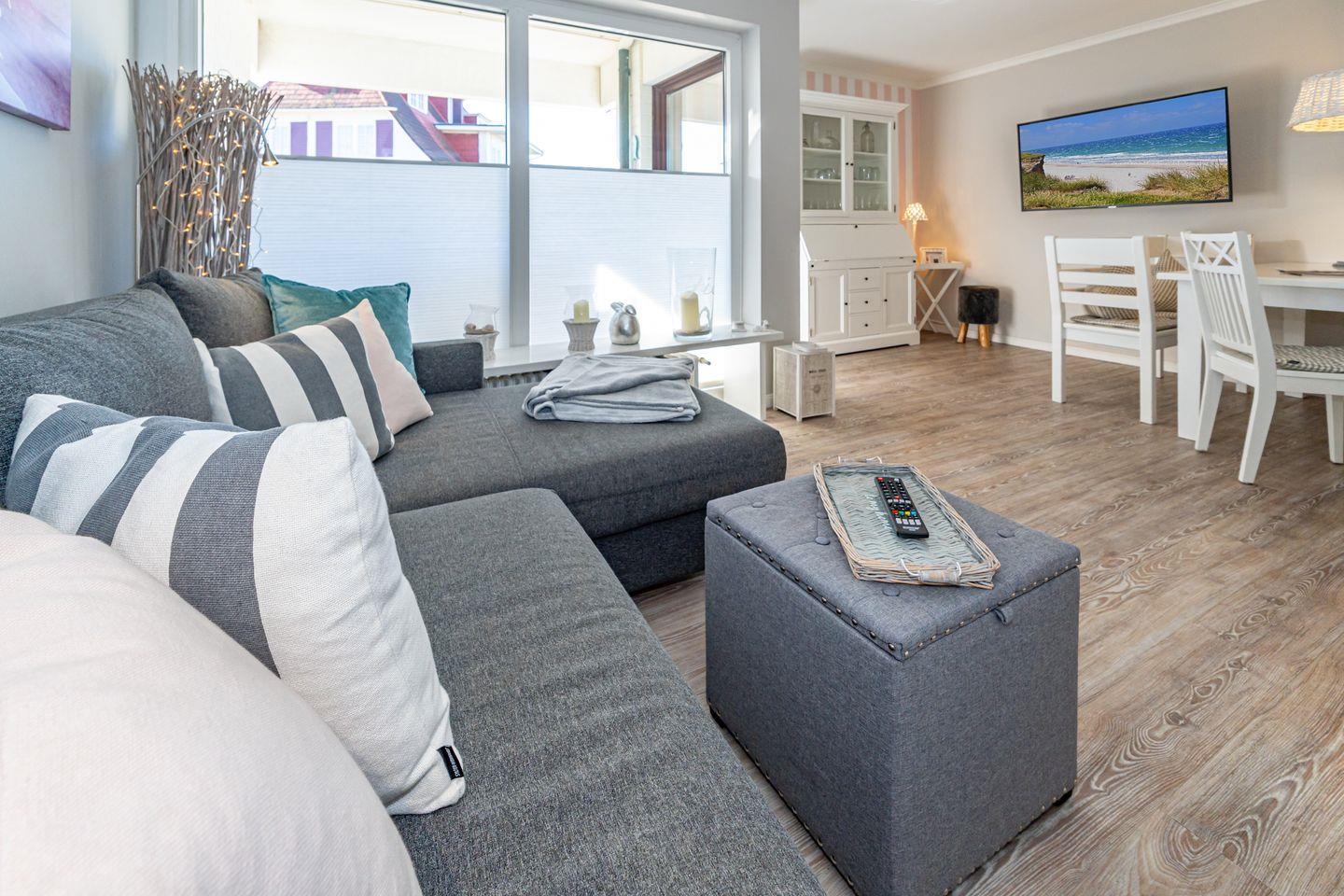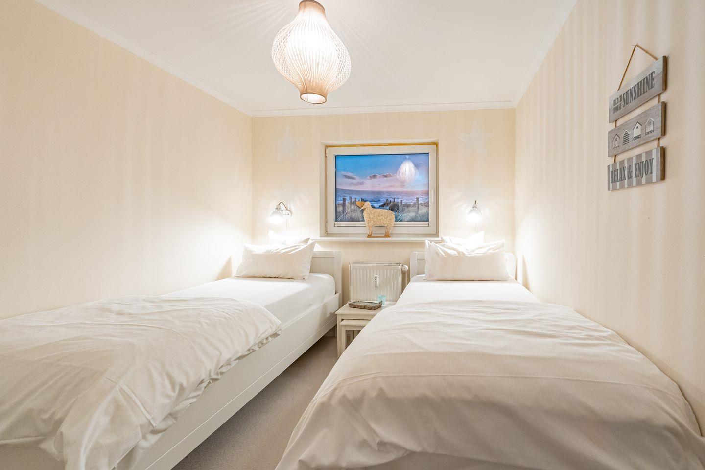 Im Erdgeschoss dieser Ferienwohnung befinden sich der Wohn- und Essbereich mit Sofa und ein SMART TV mit Magenta TV, eine voll ausgestattete, offene Küche (Spülmaschine, Cerankochfeld, Back-Kombi), ein Flur und das helle Duschbad mit WC. Vom Wohnbereich haben Sie Zugang zu der Terrasse mit Gartenmöbeln. Der Strandkorb steht Ihnen saisonal zur Verfügung. Im Souterrain liegen das zweite Duschbad mit WC und die beiden Schlafzimmer mit TV, eines mit Doppelbett (180 x 200 cm) und eines mit zwei Einzelbetten. In der Ferienwohnung steht Ihnen WLAN zur Verfügung. Eine Waschmaschine und ein Trockner sind im Gemeinschaftsraum (gegen Gebühr) vorhanden. Ein Pkw-Stellplatz gehört zu dieser Wohnung. Fahrradstellplätze befinden sich am Haus. Hunde sind auf Anfrage in dieser Ferienwohnung erlaubt (10,- € pro Tier/Tag). Weitere Bilder unter www.meerquartiere-sylt.de