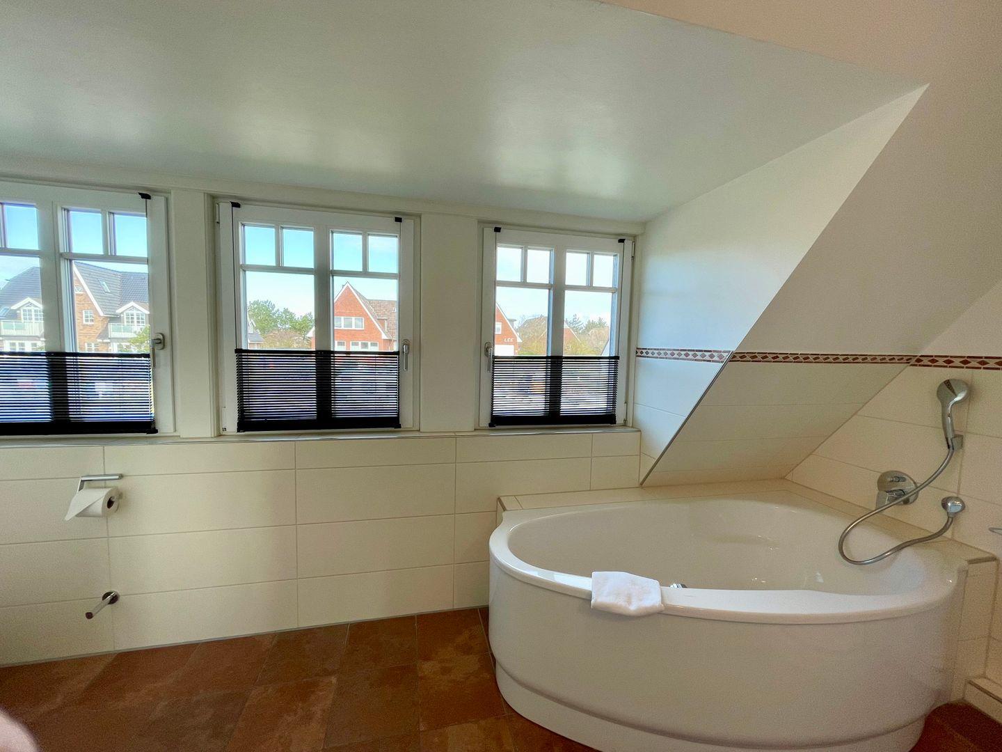 Dieses großzügige Haus präsentiert sich im Landhausstil mit hochwertigen Materialien und warmen Farben. Das sehr große Wohnzimmer mit Parkettfußboden, Esstisch und gemütlicher Sitzgarnitur ist das Herzstück dieses Hauses. Angrenzend befindet sich dann die wind- und sichtgeschützte Terrasse mit eigenem Strandkorb und Gartenmöbeln. Im Erdgeschoss befindet sich ebenfalls die separate Küche, sowie ein Schlafzimmer mit Doppelbett und ein Schlafzimmer mit Einzelbett.