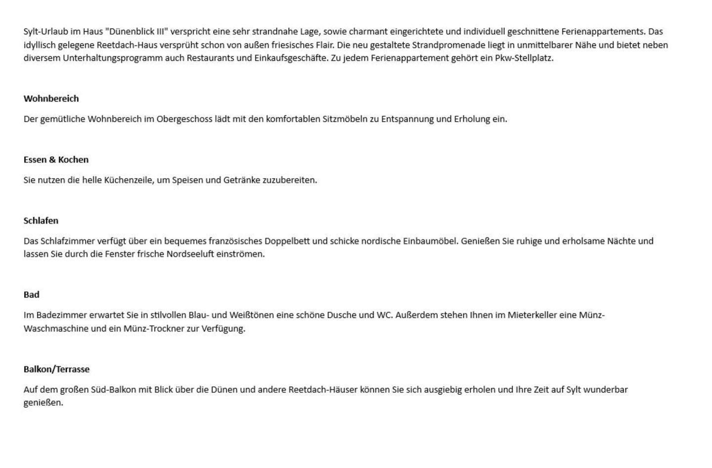 Sylt-Urlaub im Haus "Dünenblick III" verspricht eine sehr strandnahe Lage, sowie charmant eingerichtete und individuell geschnittene Ferienappartements. Das idyllisch gelegene Reetdach-Haus versprüht schon von außen friesisches Flair. Die neu gestaltete Strandpromenade liegt in unmittelbarer Nähe und bietet neben diversem Unterhaltungsprogramm auch Restaurants und Einkaufsgeschäfte. Zu jedem Ferienappartement gehört ein Pkw-Stellplatz.