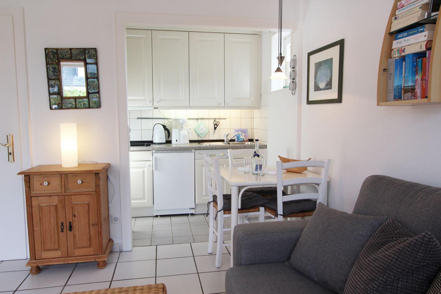 In der Kochnische, die an den Wohnbereich angrenzt, können Sie sich kleinere Speisen und Getränke zubereiten. Der Esstisch bietet Platz für zwei Personen.