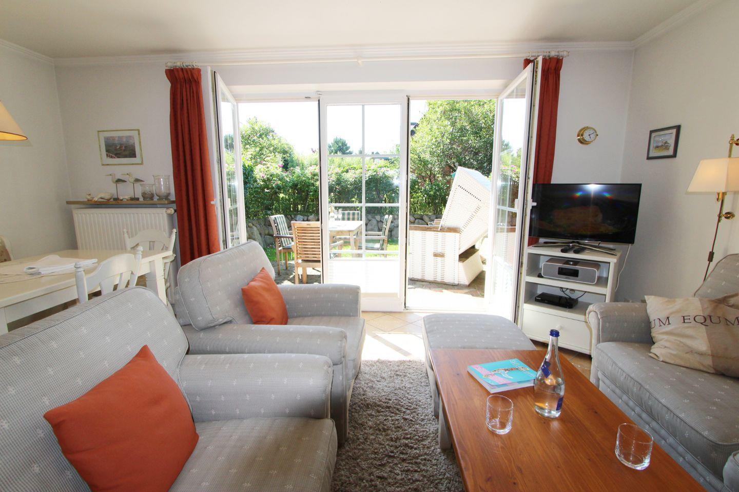 Im gemütlichen Wohnbereich können Sie sich auf der bequemen Sofagarnitur von den Sorgen des Alltags erholen. Mit Blick auf die sehenswerte Gartenfläche entspannen Sie hier ideal.