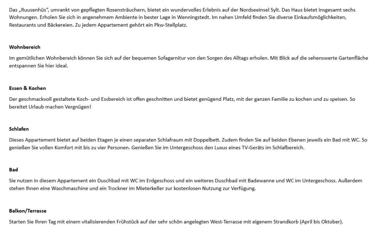 Das „Ruusenhüs“, umrankt von gepflegten Rosensträuchern, bietet ein wundervolles Erlebnis auf der Nordseeinsel Sylt. Das Haus bietet insgesamt sechs Wohnungen. Erholen Sie sich in angenehmem Ambiente in bester Lage in Wenningstedt. Im nahen Umfeld finden Sie diverse Einkaufsmöglichkeiten, Restaurants und Bäckereien. Zu jedem Appartement gehört ein Pkw-Stellplatz.