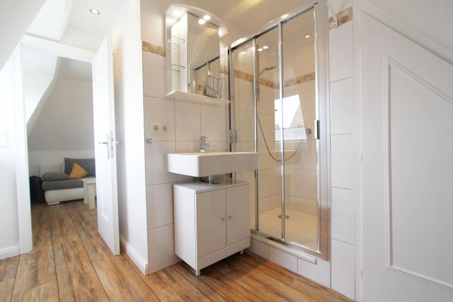 Das Badezimmer mit Dusche und WC liegt auf einer Ebene mit dem Wohn- und Essbereich. Die Kombination aus hellen Weiß- und Sandtönen harmoniert herrlich mit dem rustikalen Boden in Holzoptik und den hochwertigen Vollholz-Möbeln.