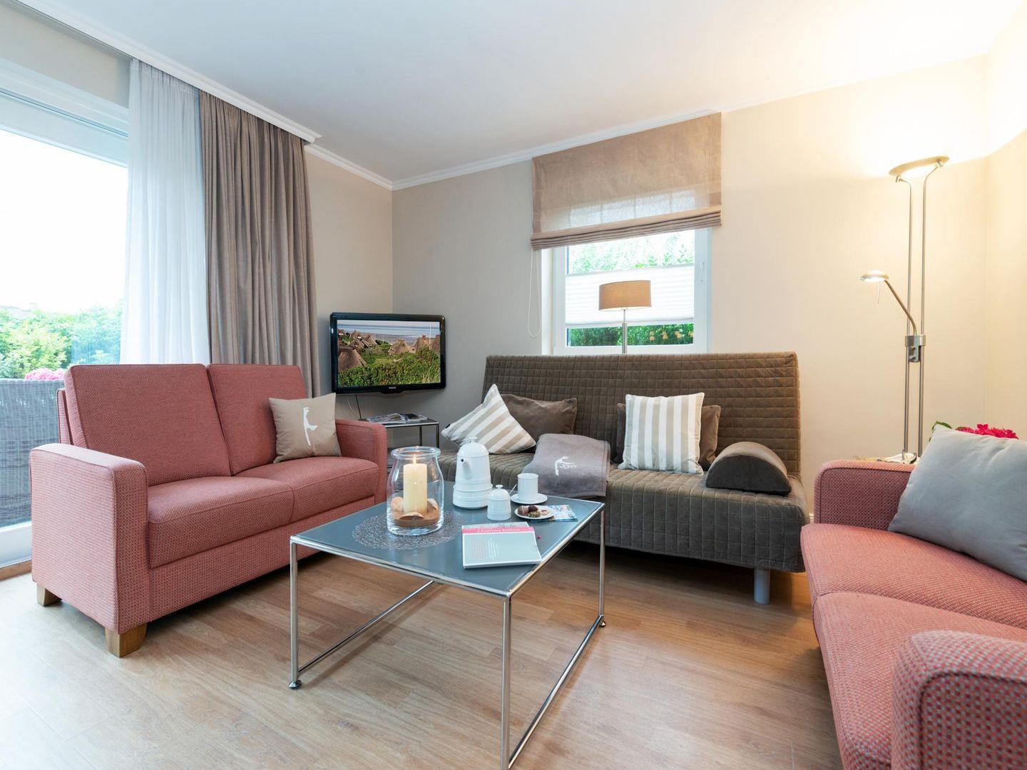 Der helle Wohnbereich im Erdgeschoss überzeugt mit bequemen Sitzmöbeln und einer warmen, gemütlichen Farbgebung. Machen Sie es sich in dem freundlichen Ambiente bei Kerzenschein gemütlich!