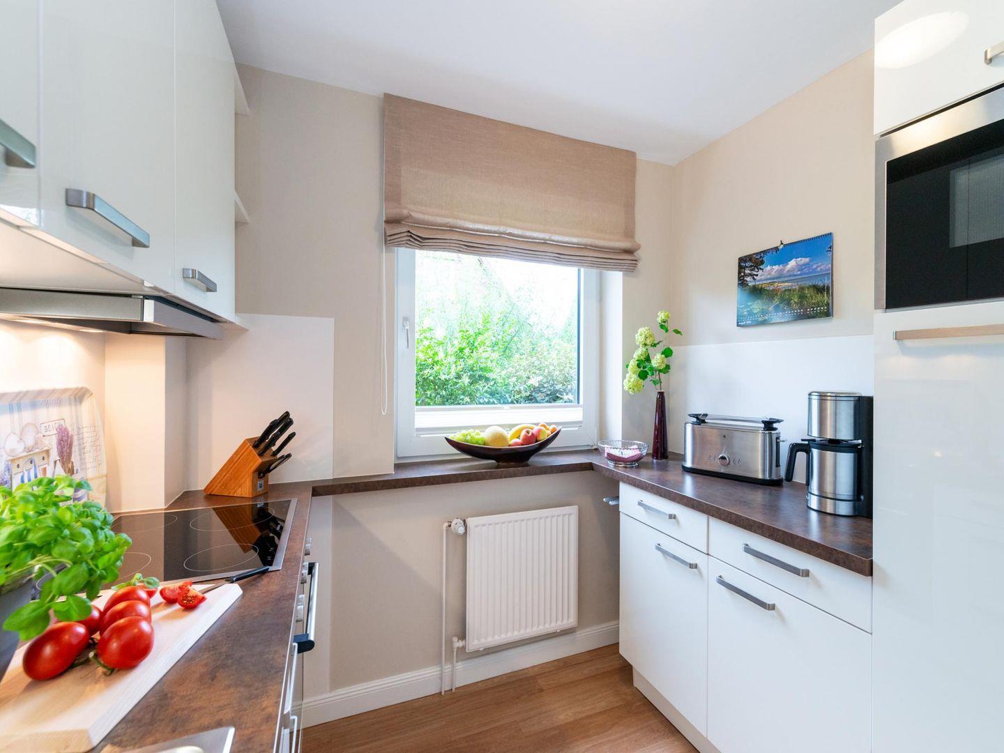 In der separaten, hochwertig ausgestatteten Küche können Sie nach Herzenslust kochen. Der großzügige Essensplatz befindet sich an den Wohnbereich angrenzend und lädt zu entspannten Mahlzeiten mit bis zu sechs Personen ein.