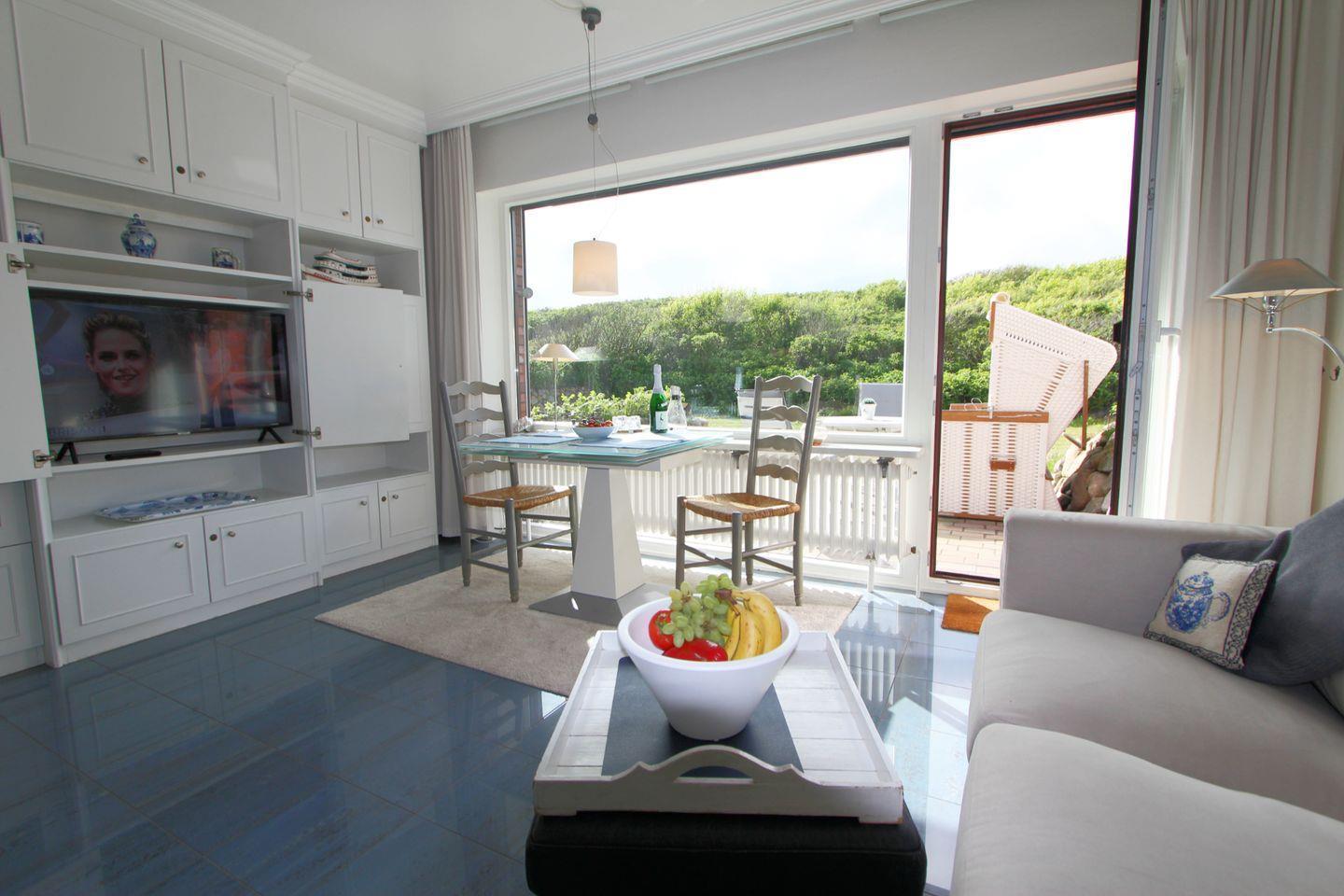 Zum Kochen können Sie die gut ausgestattete, neuwertige Kochnische nutzen, die direkt an den Wohnbereich angrenzt. Gespeist wird an der breiten Fensterfront mit fantastischem Dünenblick.
