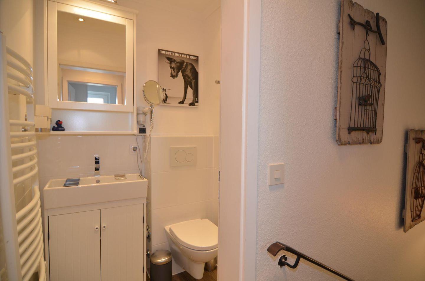 In diesem Appartement finden Sie zwei Schlafzimmer. Direkt im Eingangsbereich liegt der Doppelschlafraum mit zwei Einzelbetten. Das zweite Schlafzimmer erreichen Sie über eine schmale Wendeltreppe ins Dachgeschoss. Dieses bietet ebenfalls zwei bequeme Einzelbetten.