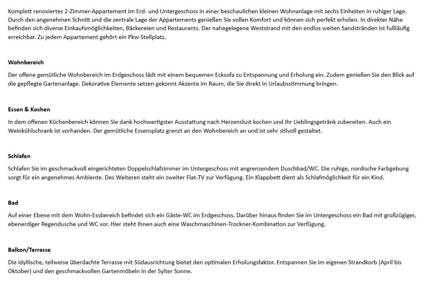 Frisch renoviertes Ferienappartement im Erd- und Untergeschoss in idealer Lage in Wenningstedt. Die moderne Einrichtung wird Sie vollends überzeugen! Genießen Sie Sylt-Urlaub von seiner schönsten Seite!