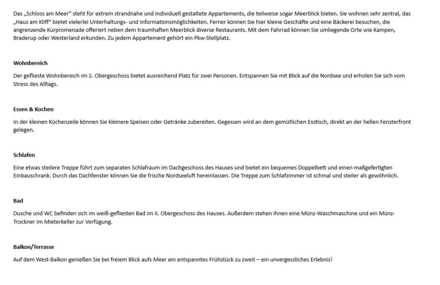 Das „Schloss am Meer“ steht für extrem strandnahe und individuell gestaltete Appartements, die teilweise sogar Meerblick bieten. Sie wohnen sehr zentral, das „Haus am Kliff“ bietet vielerlei Unterhaltungs- und Informationsmöglichkeiten. Ferner können Sie hier kleine Geschäfte und eine Bäckerei besuchen, die angrenzende Kurpromenade offeriert neben dem traumhaften Meerblick diverse Restaurants. Mit dem Fahrrad können Sie umliegende Orte wie Kampen, Braderup oder Westerland erkunden. Zu jedem Appartement gehört ein Pkw-Stellplatz.