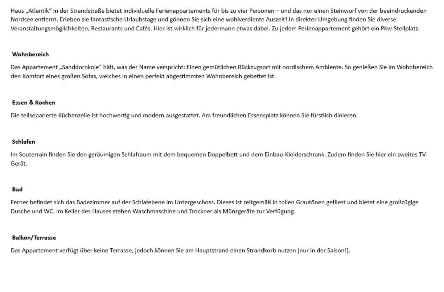 Stilvoll eingerichtetes Ferienappartement im Erd- und Untergeschoss nahe der modernen Strandpromenade von Wenningstedt. Genießen Sie die stimmige Einrichtung und die zentrale Lage im Ort. Als besonderes Highlight steht Ihnen in der Saison ein Strandkorb am Hauptstrand zur freien Nutzung zur Verfügung!