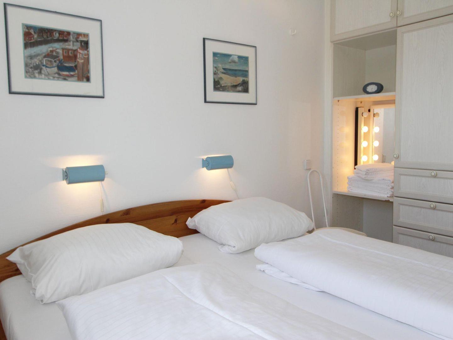 Der separate Schlafraum bietet ein Doppelbett und einen geräumigen Kleiderschrank. Über das Fenster in Richtung Osten können Sie die frische Sylt-Luft einströmen lassen. Zudem steht im Wohnzimmer eine Schlafcouch als weitere Schlafmöglichkeit zur Verfügung.