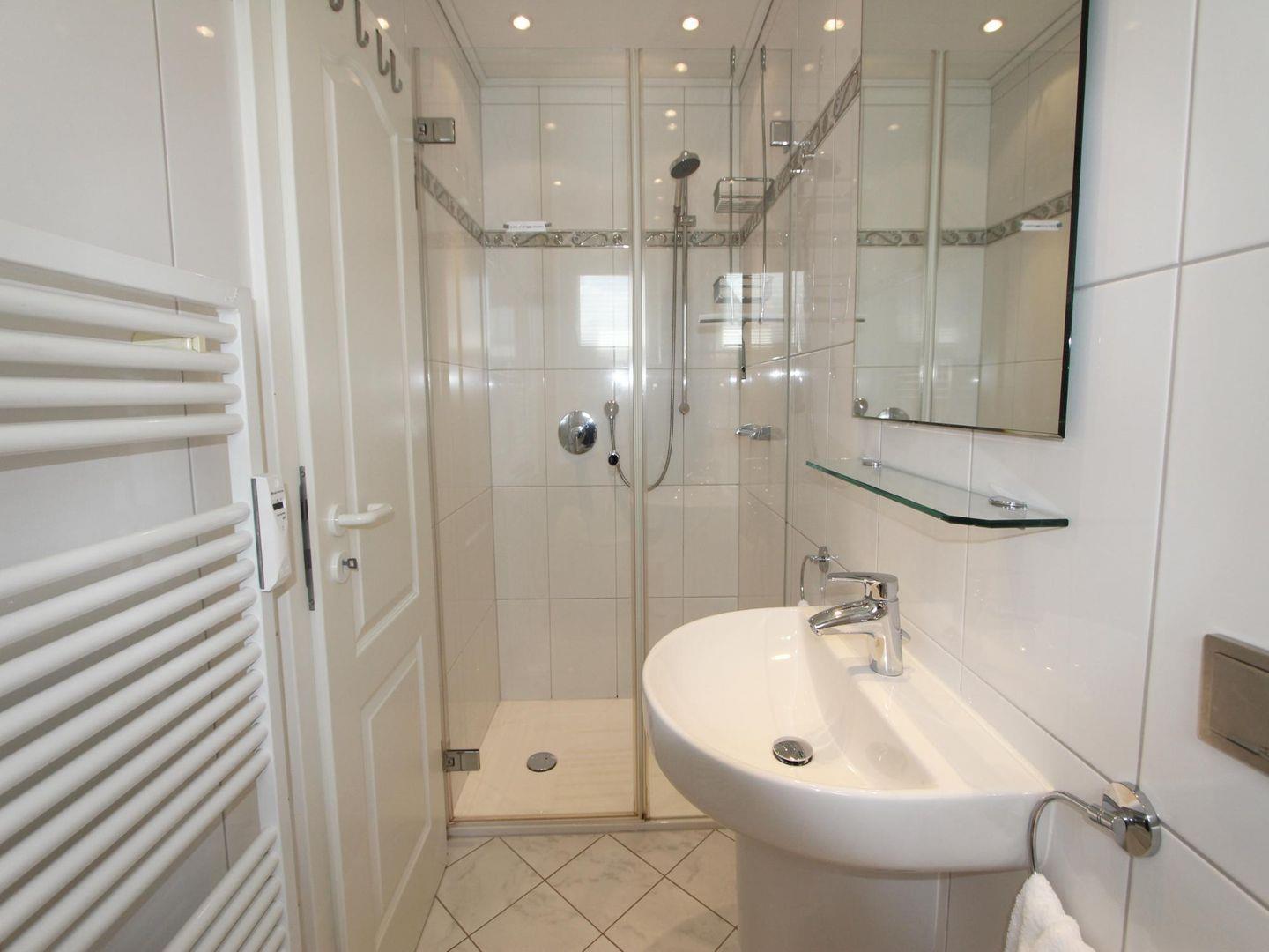 Das Badezimmer ist weiß gefliest und durch ein Fenster vom Tageslicht erhellt. Außerdem stehen Ihnen eine Münz-Waschmaschine und ein Münz-Trockner zur Verfügung.