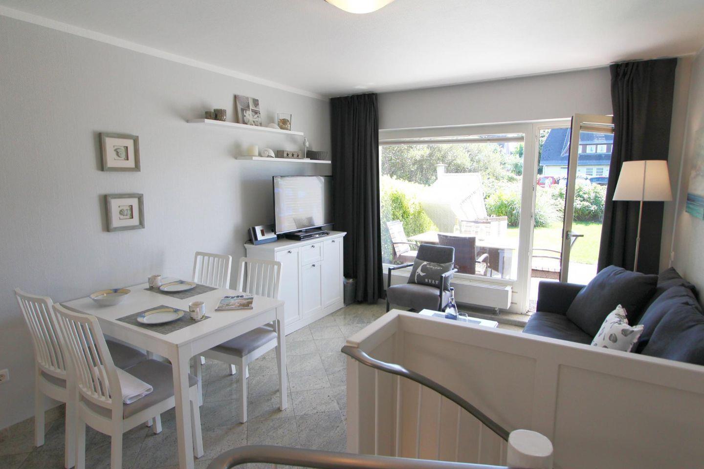 Auf der Terrasse mit Südausrichtung stehen Ihnen im Sommer ein Strandkorb sowie eine Sitzgruppe zur Verfügung, in denen Sie die Sylter Sonne genießen können.