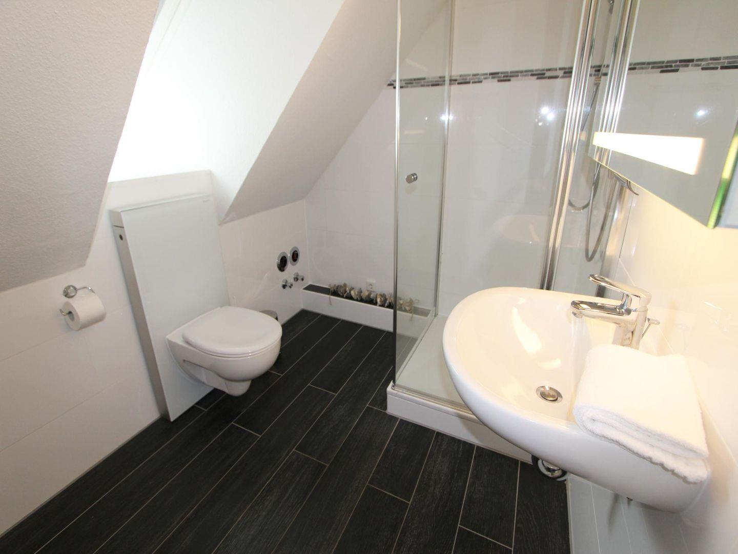 Die zwei Duschbäder mit WC in dieser Ferienwohnung sind sehr gut ausgestattet und sind ideal, wenn Sie Urlaub mit mehreren Personen machen. Eines befindet sich im Obergeschoss, das zweite im Dachgeschoss. Außerdem stehen Ihnen eine Münz-Waschmaschine und ein Münz-Trockner zur Verfügung.