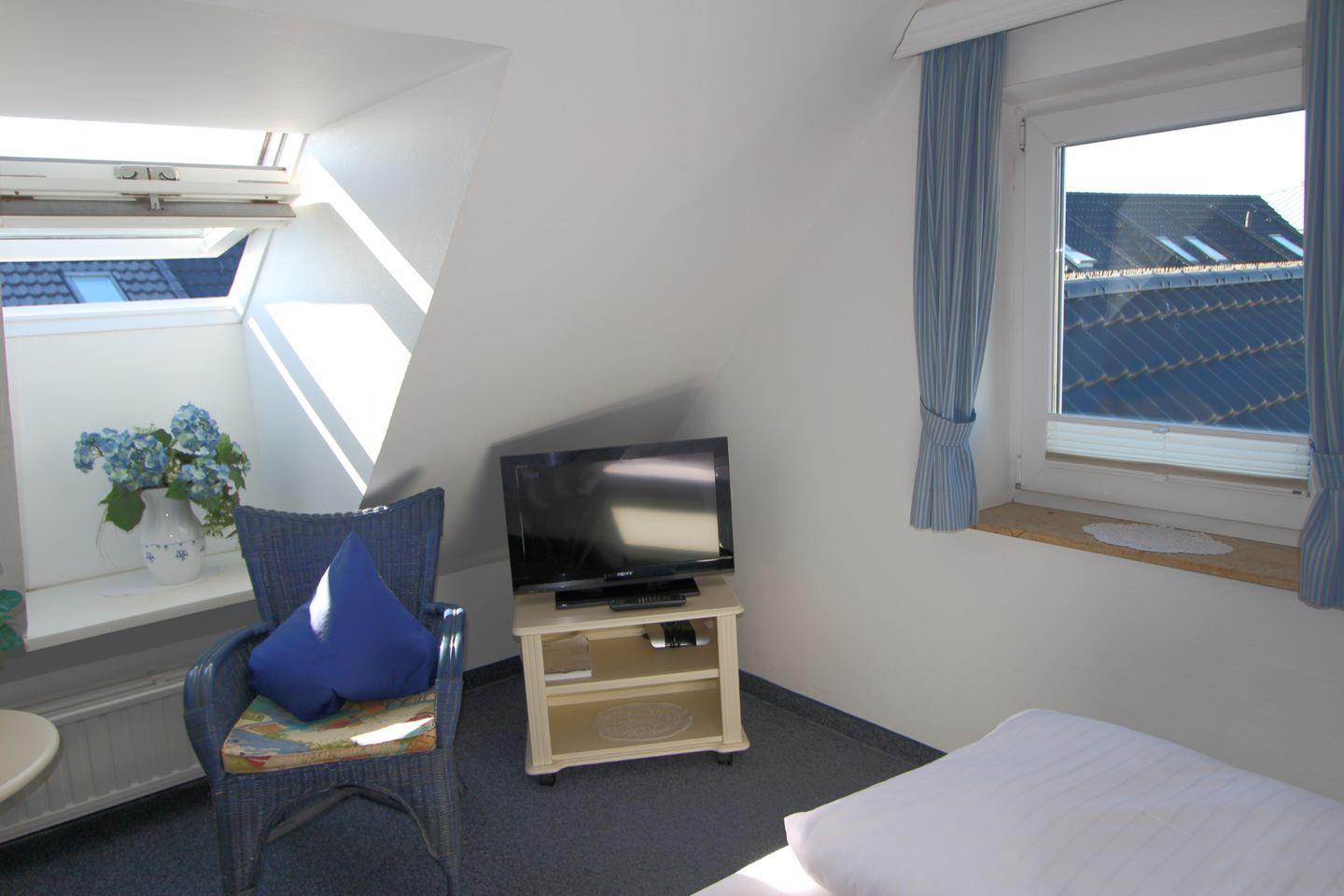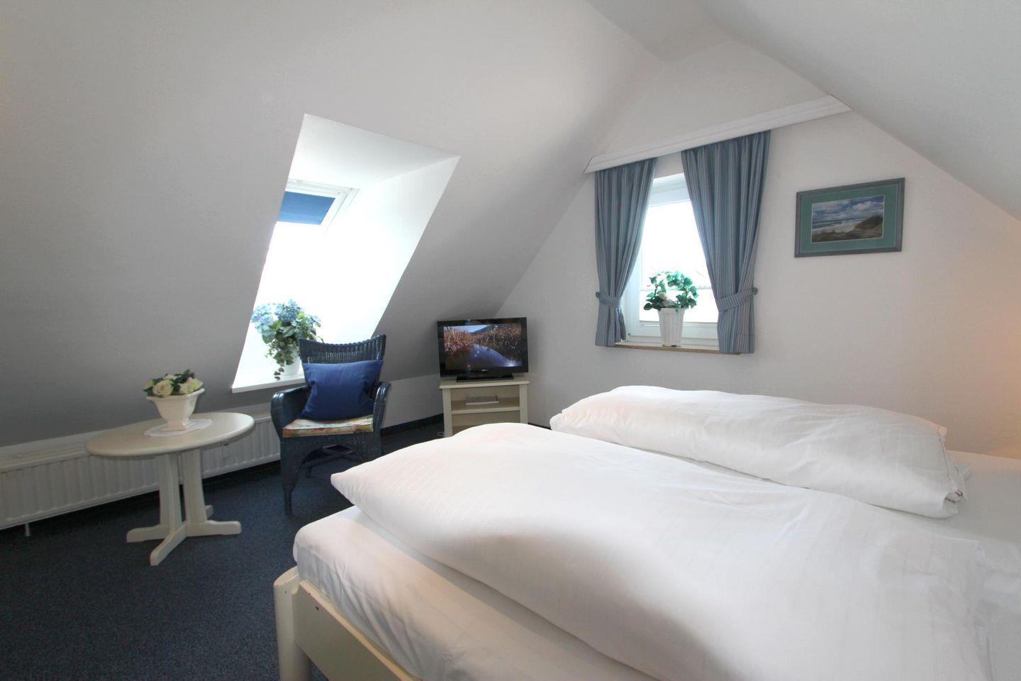 In der Ferienwohnung finden Sie zwei Schlafzimmer. Das kleine Schlafzimmer mit einem Einzelbett liegt im Obergeschoss auf einer Ebene mit dem Wohnbereich. Im zweiten Schlafzimmer mit einem bequemen Doppelbett nächtigen Sie zudem im Dachgeschoss.