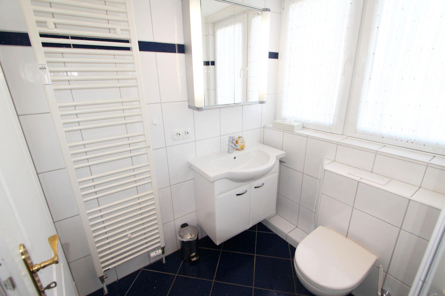 Das helle Badezimmer mit WC und Dusche befindet sich im Obergeschoss.