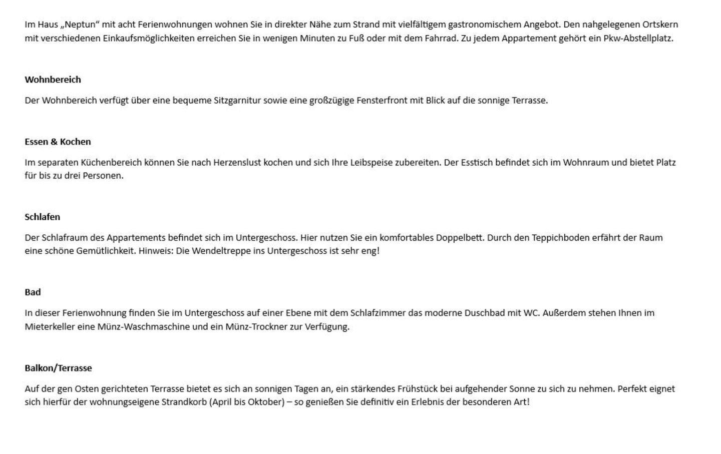 Im Haus „Neptun“ mit acht Ferienwohnungen wohnen Sie in direkter Nähe zum Strand mit vielfältigem gastronomischem Angebot. Den nahgelegenen Ortskern mit verschiedenen Einkaufsmöglichkeiten erreichen Sie in wenigen Minuten zu Fuß oder mit dem Fahrrad. Zu jedem Appartement gehört ein Pkw-Abstellplatz.