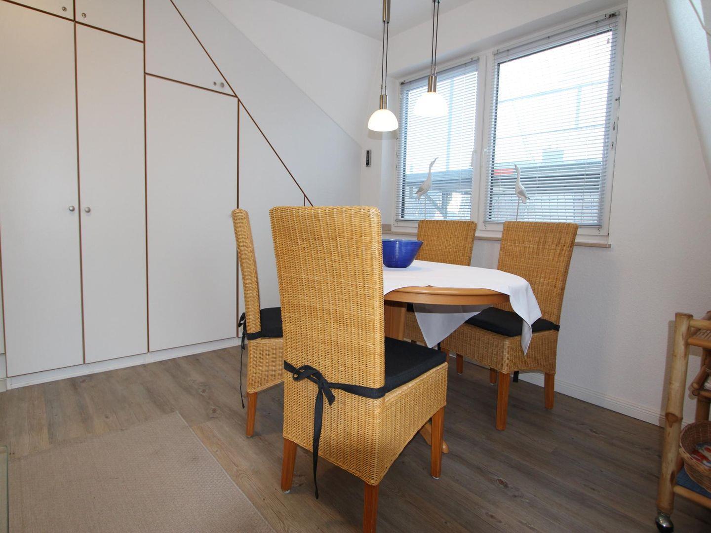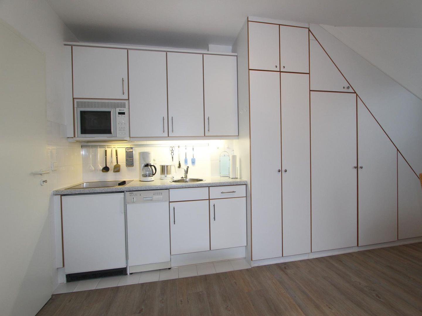 In der offenen Küchenzeile können Sie bequem kleinere Speisen und Getränke zubereiten, die Sie am hellen Essensplatz direkt am Fenster zu sich nehmen können.