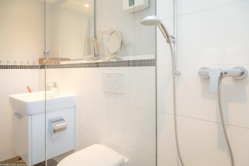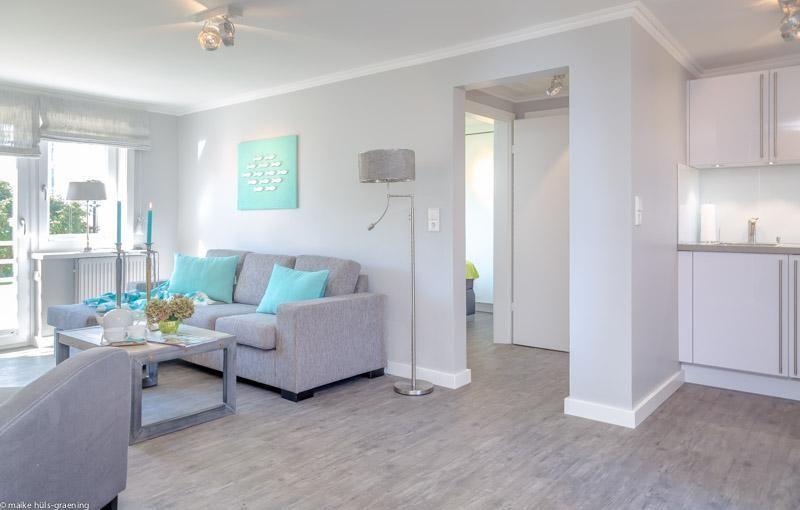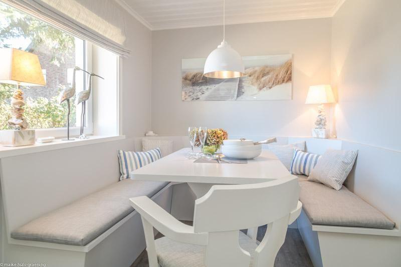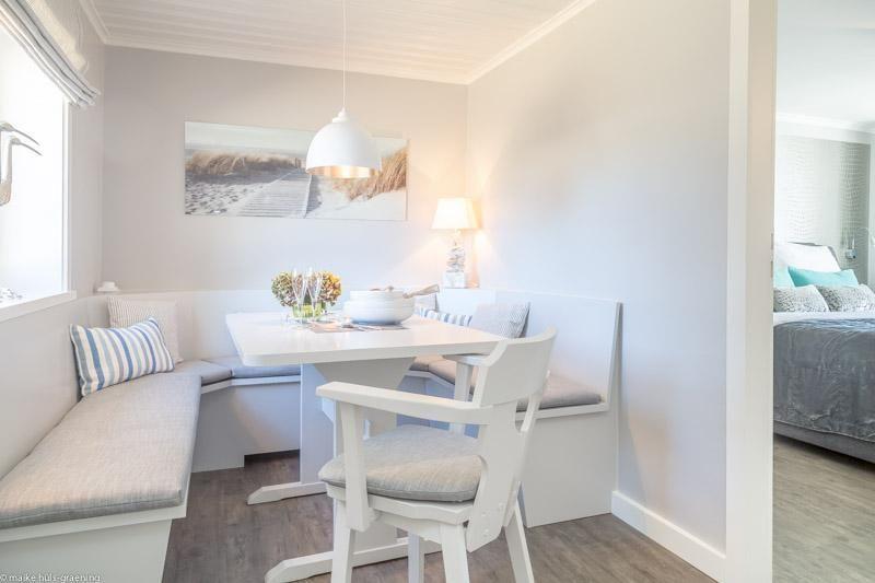 Wohnbereich, gemütliche Essecke, moderne Küche, Duschbad mit Fenster