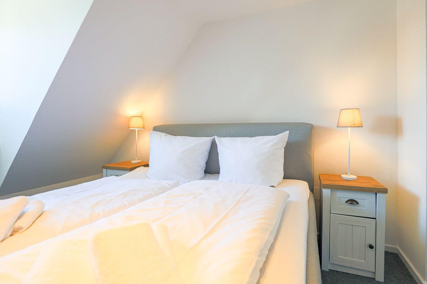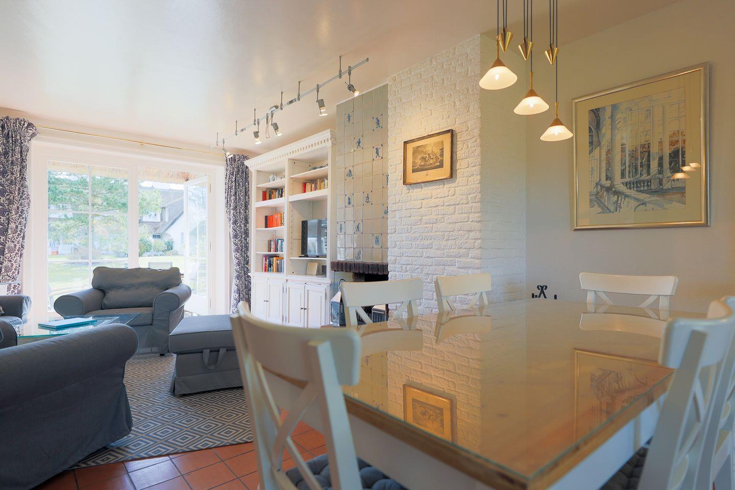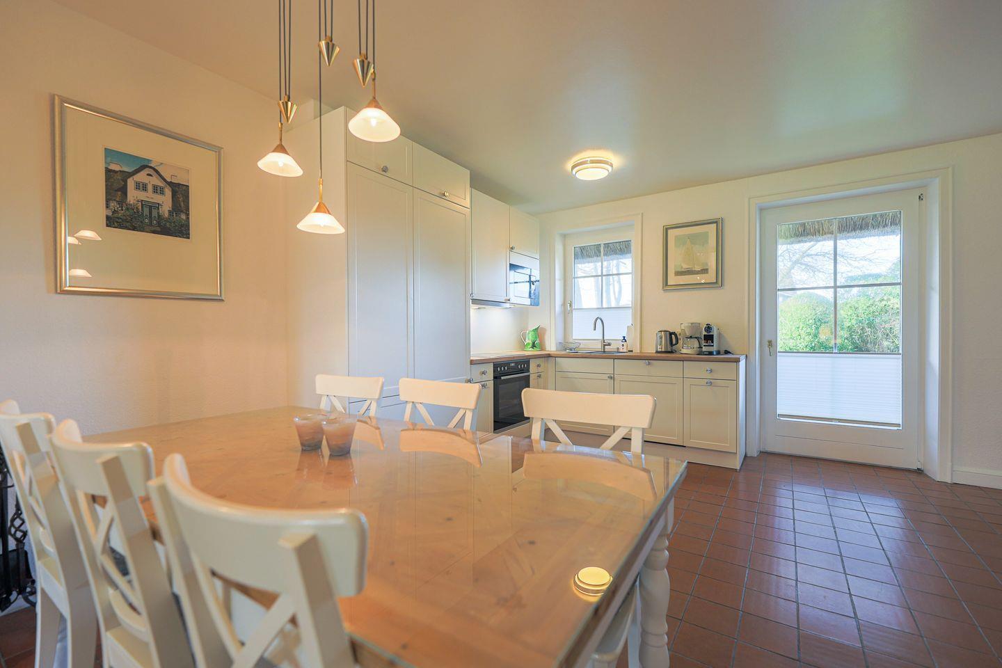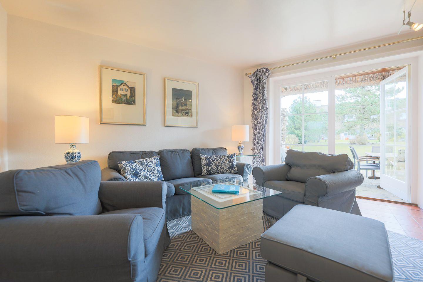 Das Erdgeschoss umfasst einen geräumigen Wohnbereich mit "Sofa-Ecke", hellen Einbauten, einem kleinen Kamin sowie einen Esstisch. Die moderne Küche bietet alles, was das Herz eines Koches begehrt. Besonders schön: Die kleine Gartenterrasse mit Strandkorb, der bei schönem Wetter zum draußen sitzen einlädt. Ebenfalls im Untergeschoss befindet sich auch noch ein kleines Gäste-WC. Eine Treppe höher, im Obergeschoss des Hauses befinden sich drei Schlafzimmer mit komfortablen Boxspringbetten (1x Doppelbett 1,80m, 1x Doppelbett 1,60m, 1x Einzelbett 90cm) sowie ein großes Duschbad.
