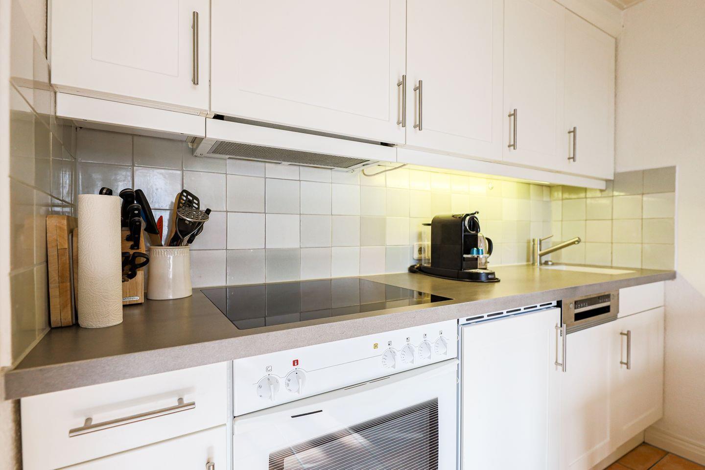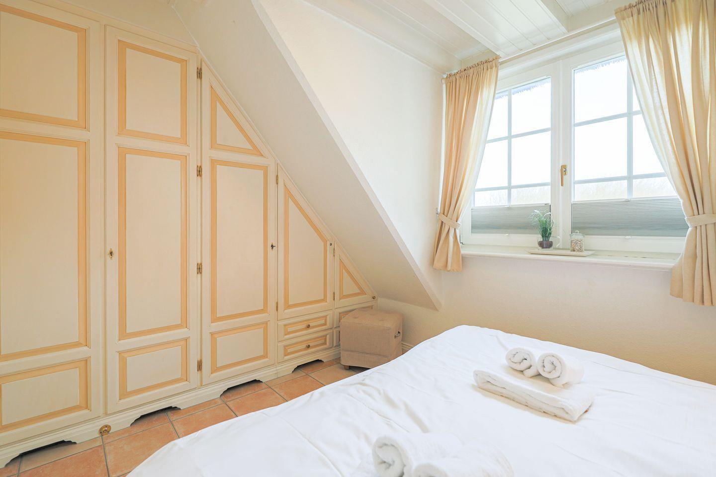 Im Untergeschoss schließt das große Wohnzimmer an eine offene Küche und den Essbereich an, wo warme Naturtöne für friesische Gemütlichkeit sorgen. Hochwertige Holzeinbauten im typischen Sylter Stil sowie ein bequemes Doppelbett machen auch das Schlafzimmer zu einem kuscheligen Ruhepol.