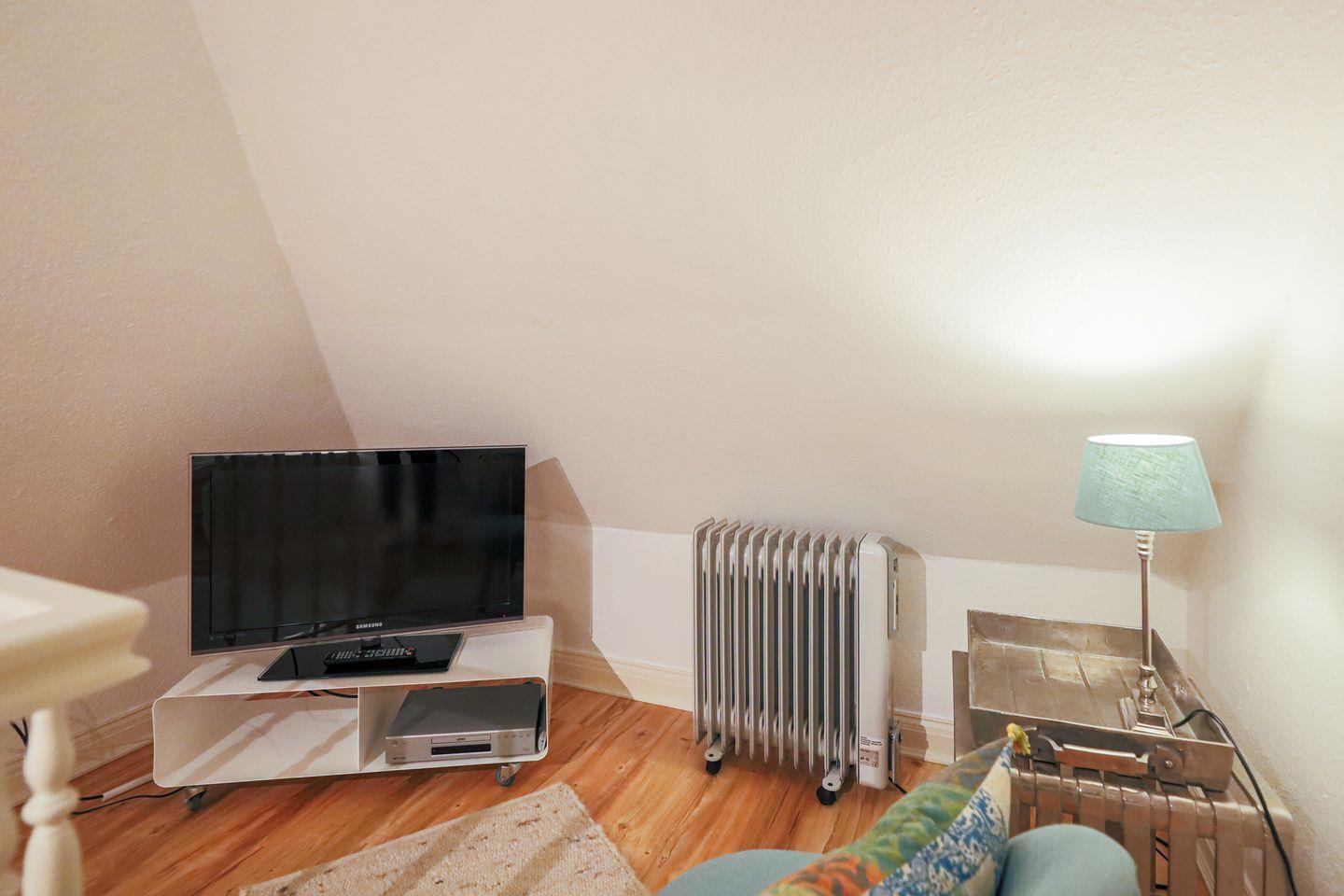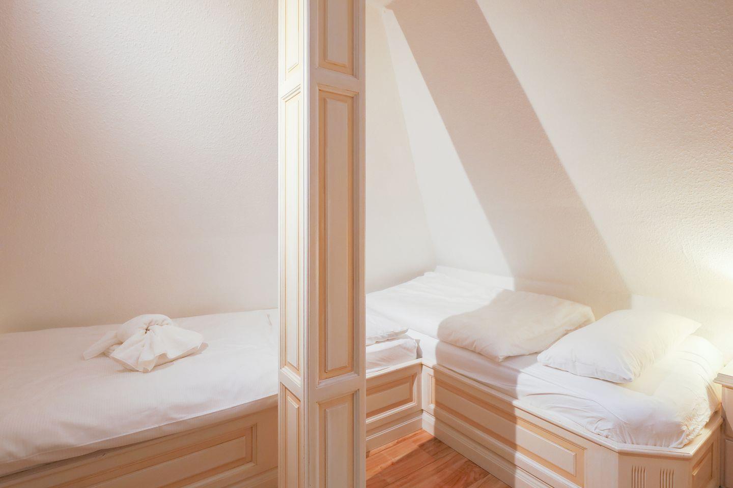 Noch uriger ist nur das Dachgeschoss, das über eine schmale Treppe zu erreichen ist. Zwei Einzelbetten und ein kleiner Loungebreich mit TV sind hier nicht nur für Kinder das Größte.