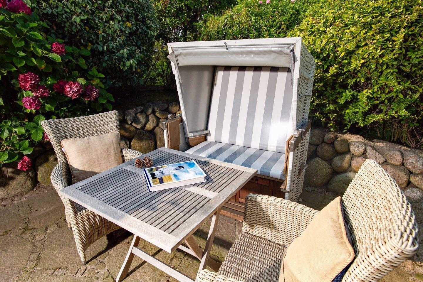 Zum Lisbeth Hus gehört eine sogenannte "Sonnenkuhle", also eine kleine Gartenterrasse inmitten der Anlage, die mit Strandkorb und Stühlen ausgestattet ist.